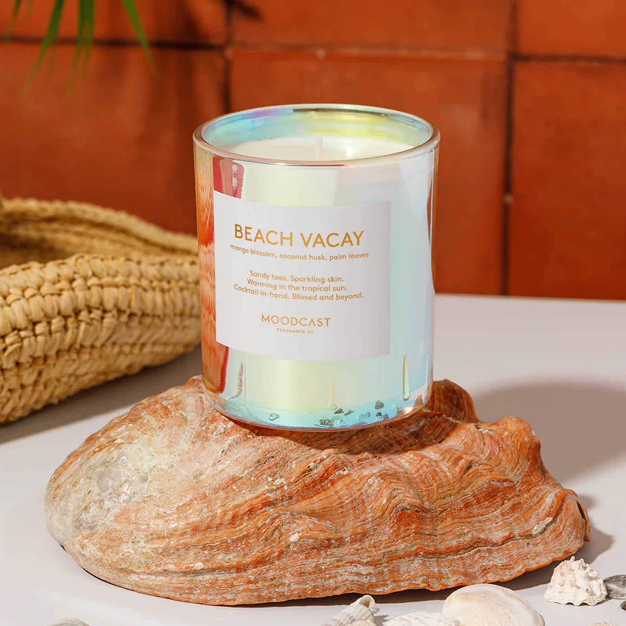 Bring the scents of a beach vacation into your home with the Beach Vacay candle by Mooncast Fragrance Co featuring notes of mango, coconut and palm leaves and homed in the most beautiful iridescent orange and vibrant pink glass jar.