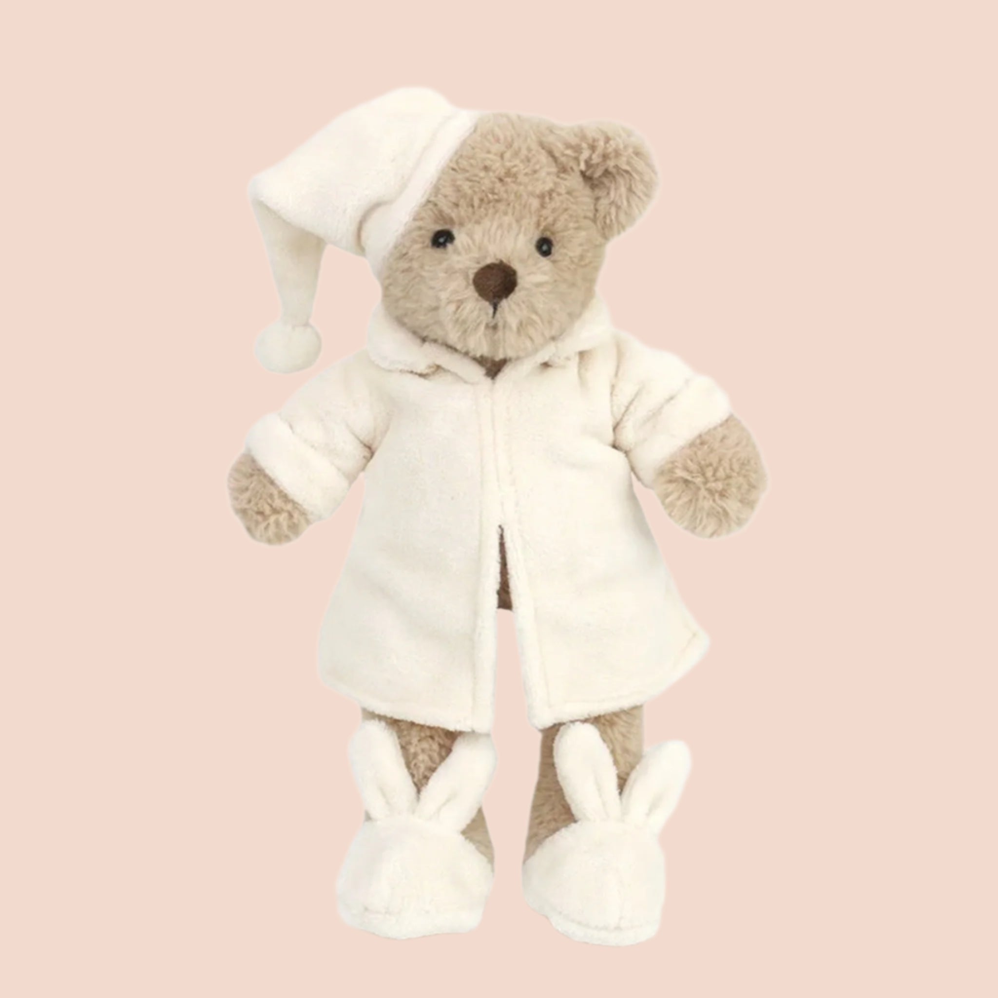 Briar Bedtime Bear, designed to be every child's perfect bedtime companion. The night cap adds a whimsical touch, while the robe ensures that Briar is always ready for a bedtime routine. But perhaps the most adorable feature of Briar Bedtime Bear is the pair of bunny plush slippers adorning its feet.