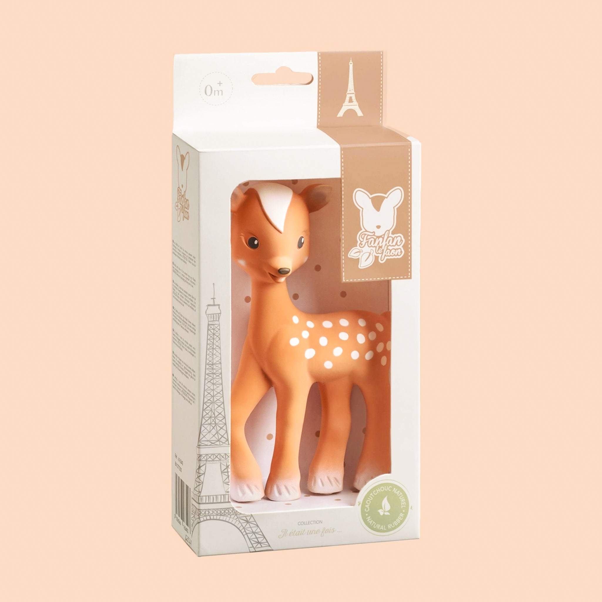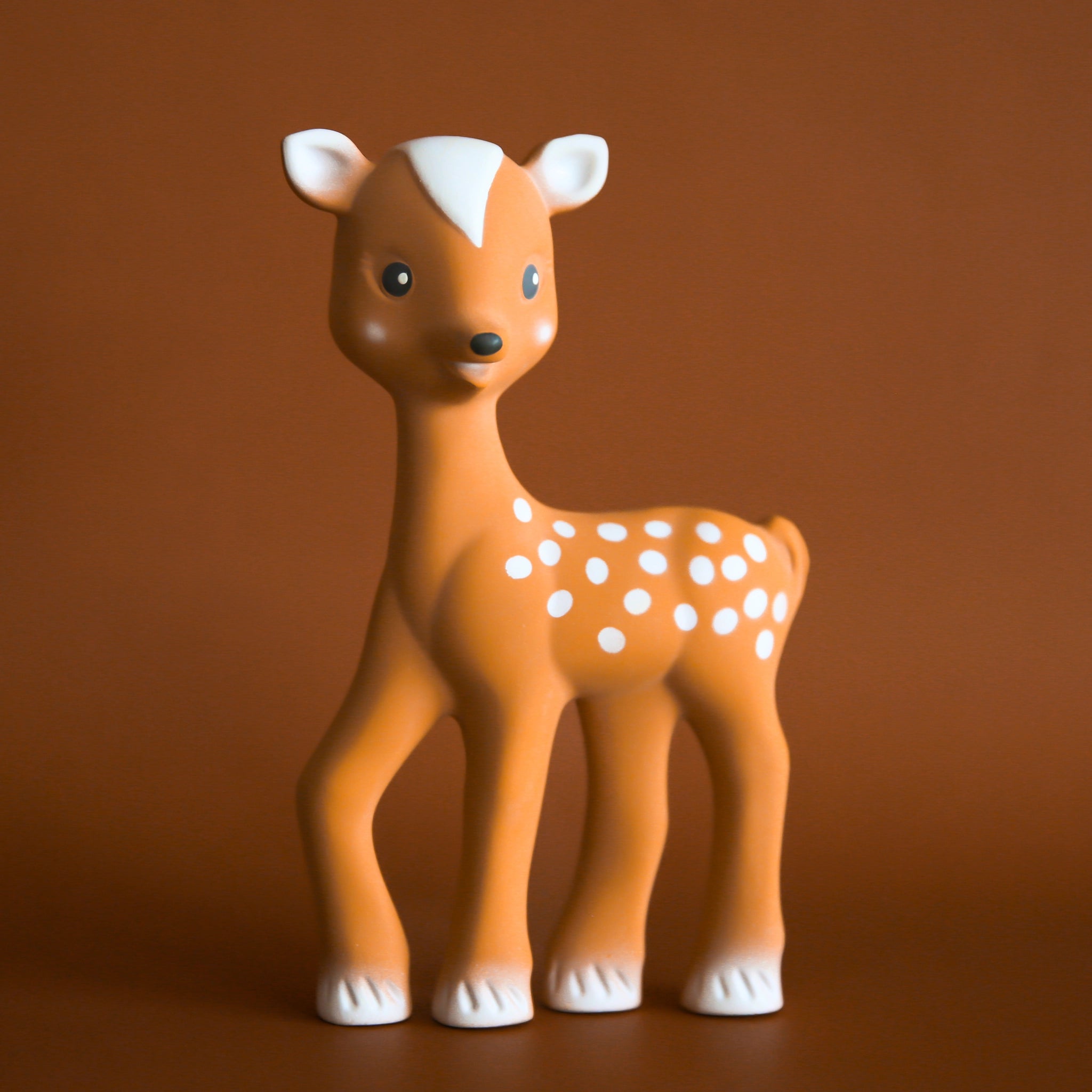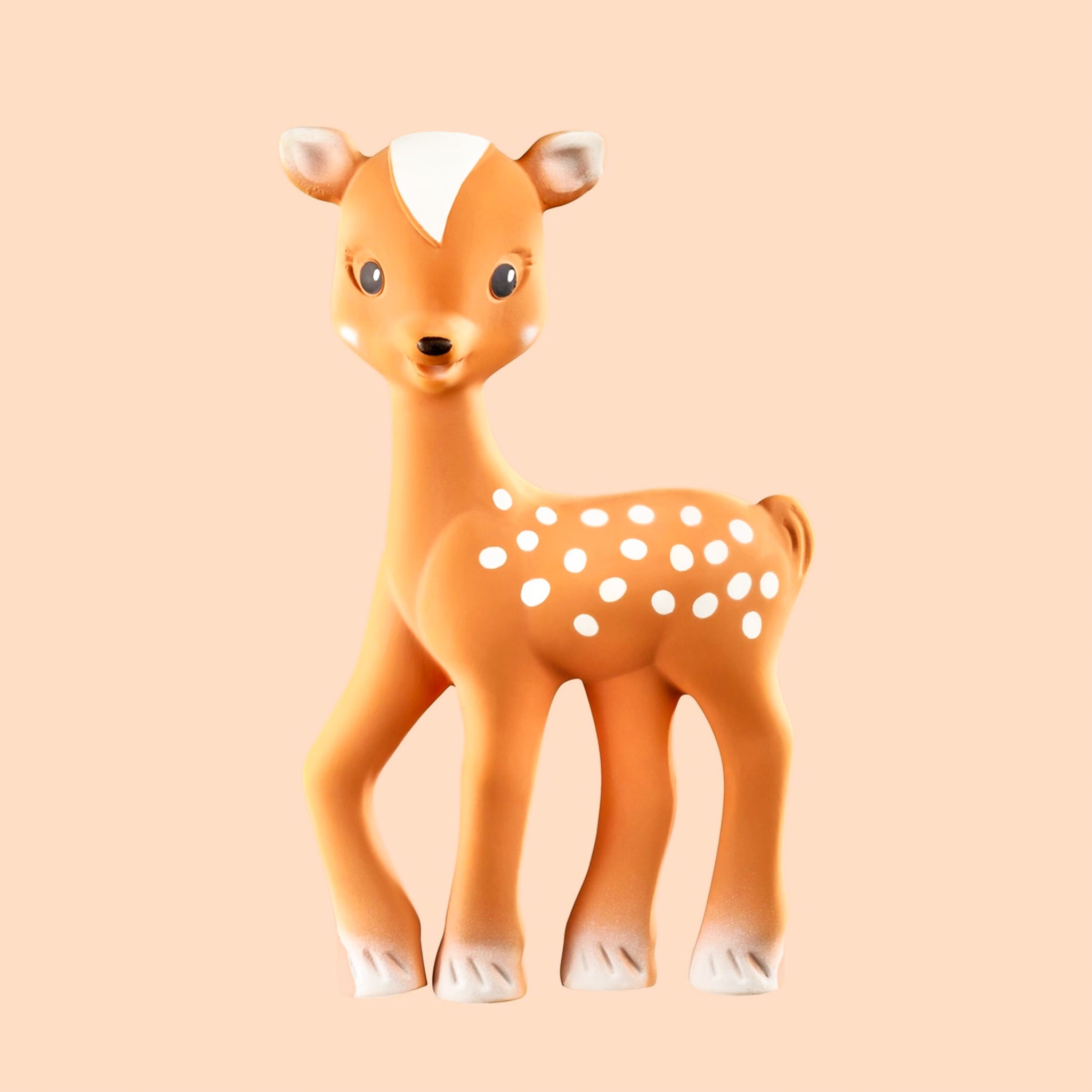 Sophie's best friend, Fanfan the Fawn soothing device made using 100% natural rubber from rubber tree latex and food-grade paint. It draws baby's gaze by way of the dark, highly contrasted spots all over its body and becomes a familiar, reassuring object that is easily recognized. Featuring a squeaker, Fanfan entertains baby, and develops baby's sense of hearing while helping to establish the relationship of cause and effect. Flexible with several chewable parts (ears, legs, etc.), it is perfectly suited to help soothe baby's gums when getting first teeth. Because it is made from 100% natural rubber and 100% food-grade paint, it is completely safe for baby.