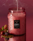 A red decorative glass jar with a black label in the center that reads, "Foraged Wildberry".