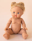 Introducing Minikane's Louise Doll - featuring blue eyes, blonde hair and two space buns on each side of her head. Louise is perfect for imaginative play and your child will love caring for their very own little babe. Clothing sold separately.