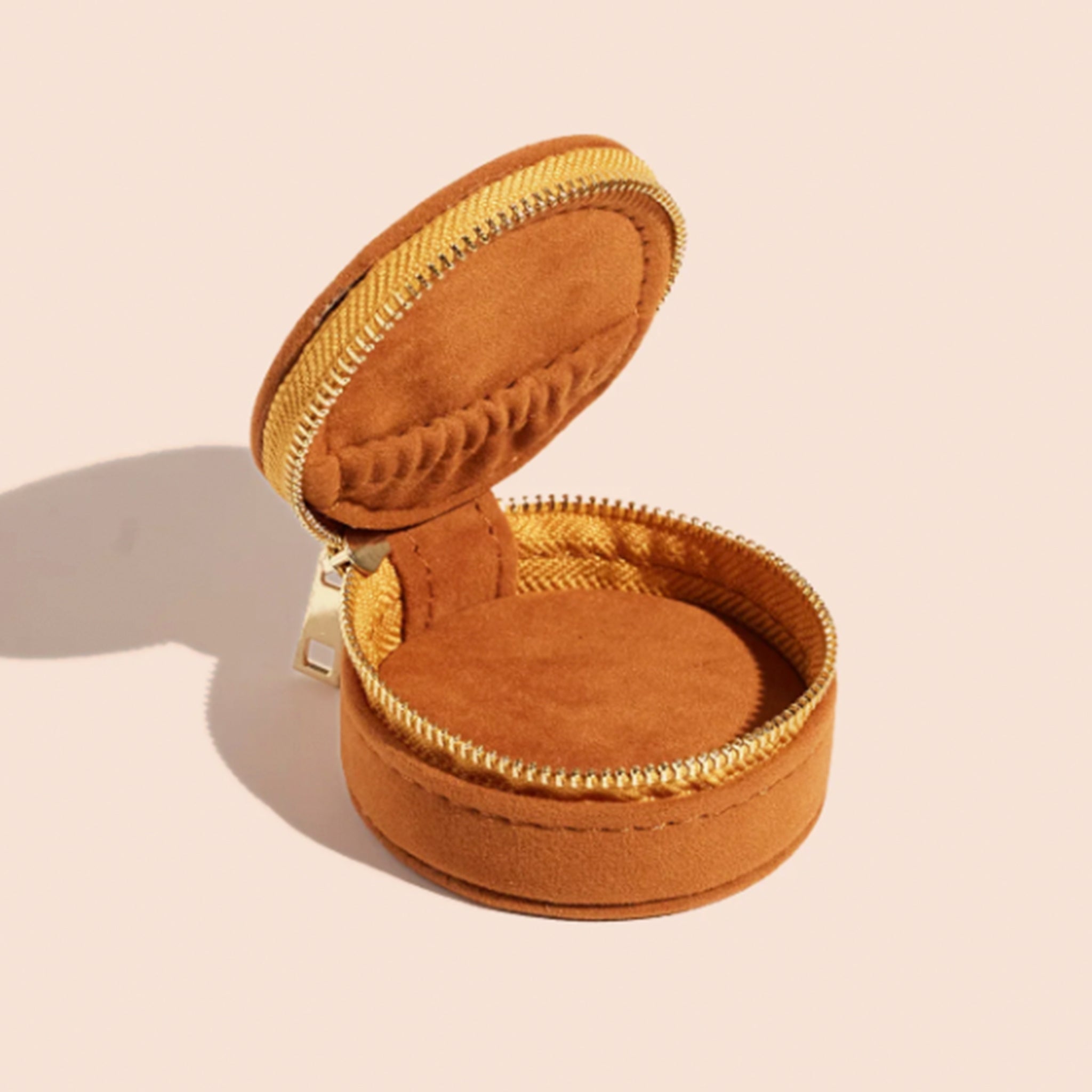 Keep your jewelry safe with Cai + Jo's mini travel jewelry cases! Embroidered with a radiant sun, this burnt orange case make for the perfect way to take your jewelry on a weekend trip without it getting tangled or lost in your bag!