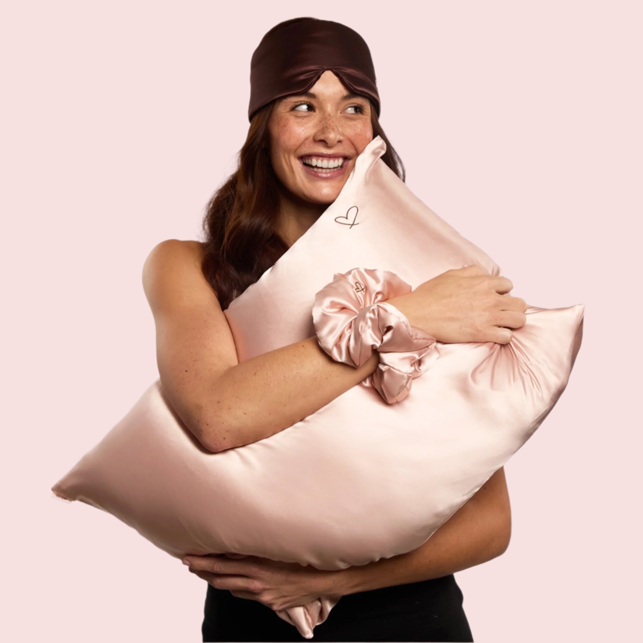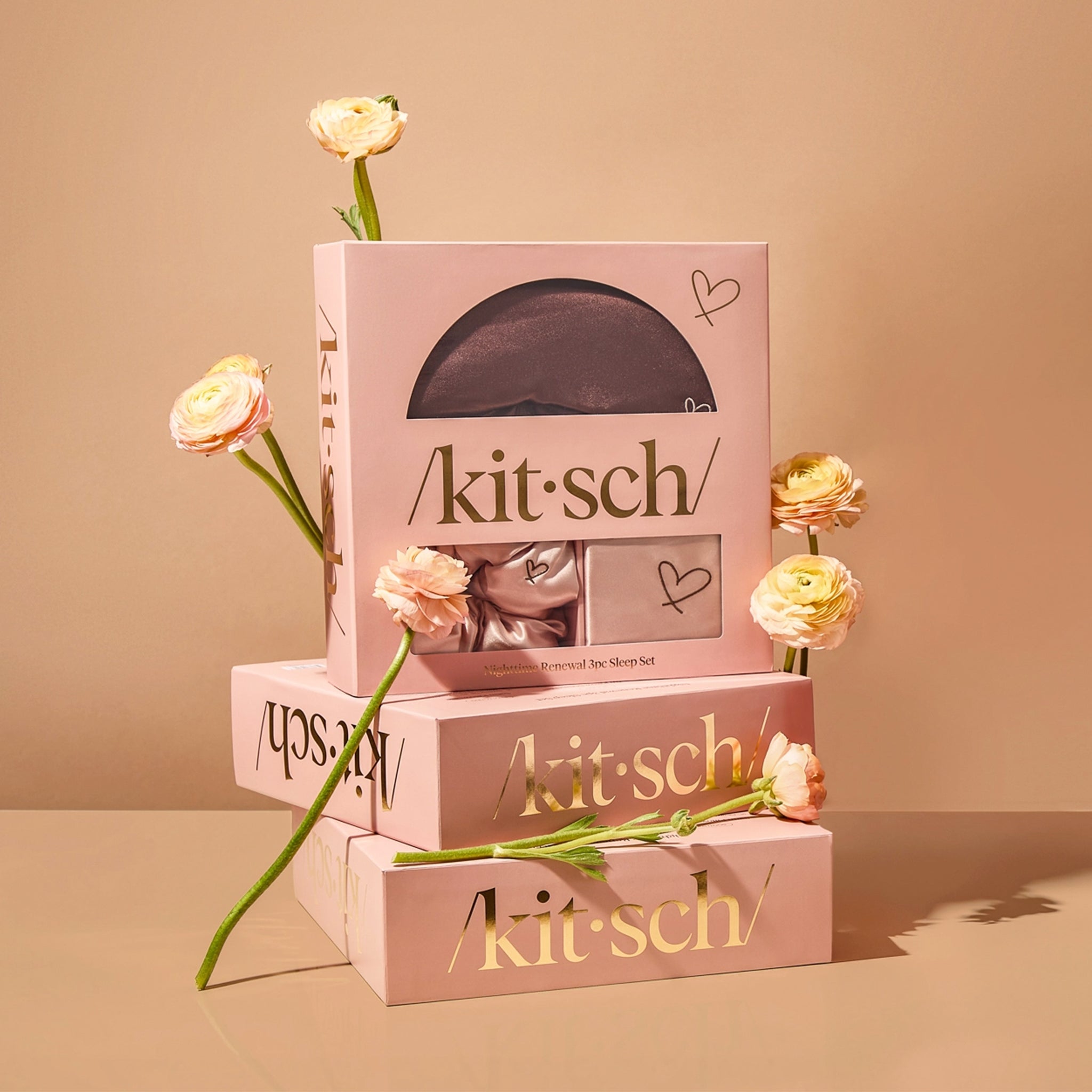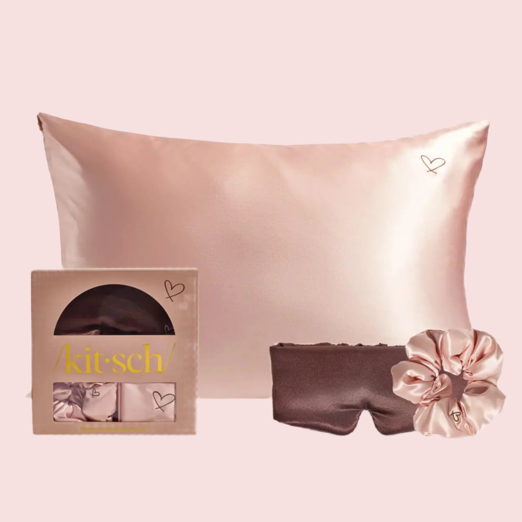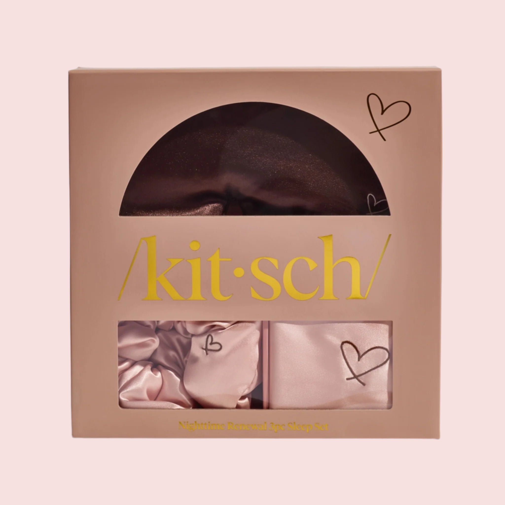 Unlock a rejuvenating night's sleep with Kitsch's Nighttime Renewal 3-piece Sleep Set. Perfect as a gift, this set includes a luxurious pillow case, a soothing eye mask, and a stylish scrunchie - all in a gorgeous pink and brown color scheme. Wake up feeling refreshed and renewed with this incredible set!