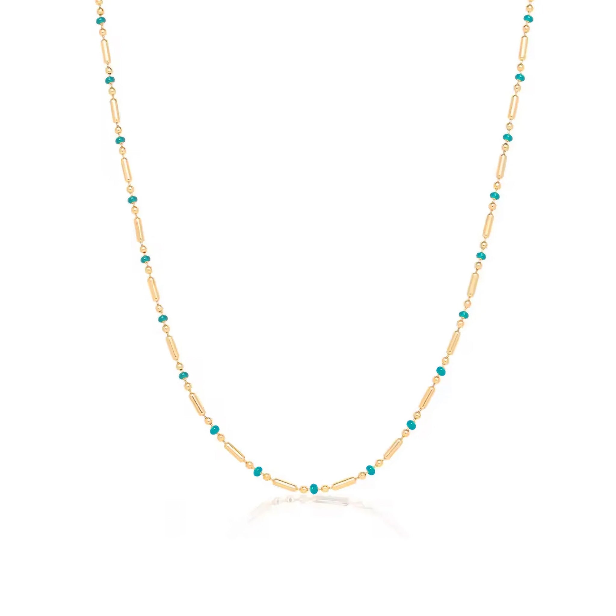 Add a pop of color to your jewelry collection with this enamel turquoise color ball chain necklace. Made with 18K gold plated stainless steel, this 16" + extension necklace is sure to add a touch of fun and playfulness to any outfit.