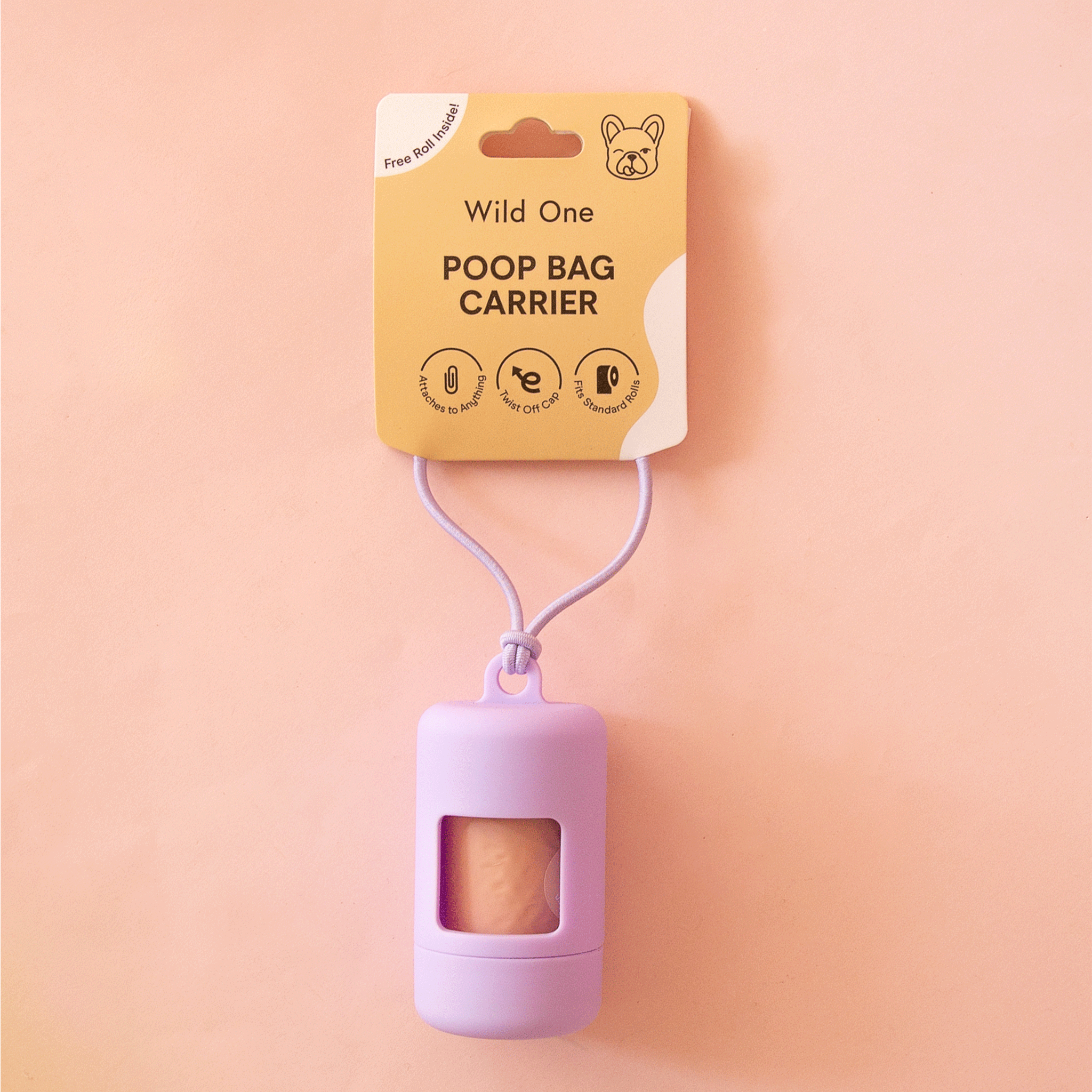 Finally a happy, and cute, home for poop bags. Complete with a lavender elastic strap to easily attach onto any leash or tote, a twist top to make reloading a breeze, and a complementary roll of our Wild One's eco-friendly Poop Bags!