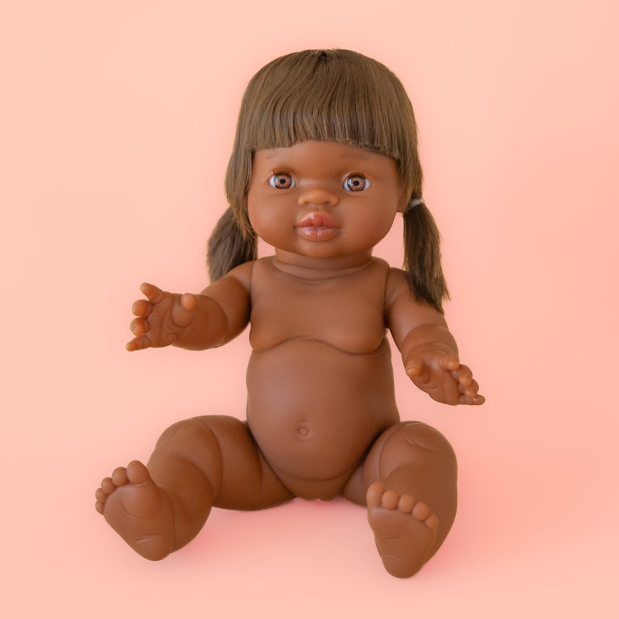 Meet Salome, the sweetest baby doll ever! With her beautiful brown eyes, she's ready for play time adventures. Made by the stylish French brand Minikane, she's not just a toy but a must-have for your little one's collection. Get ready for some adorable fun! Clothing and accessories sold separately.