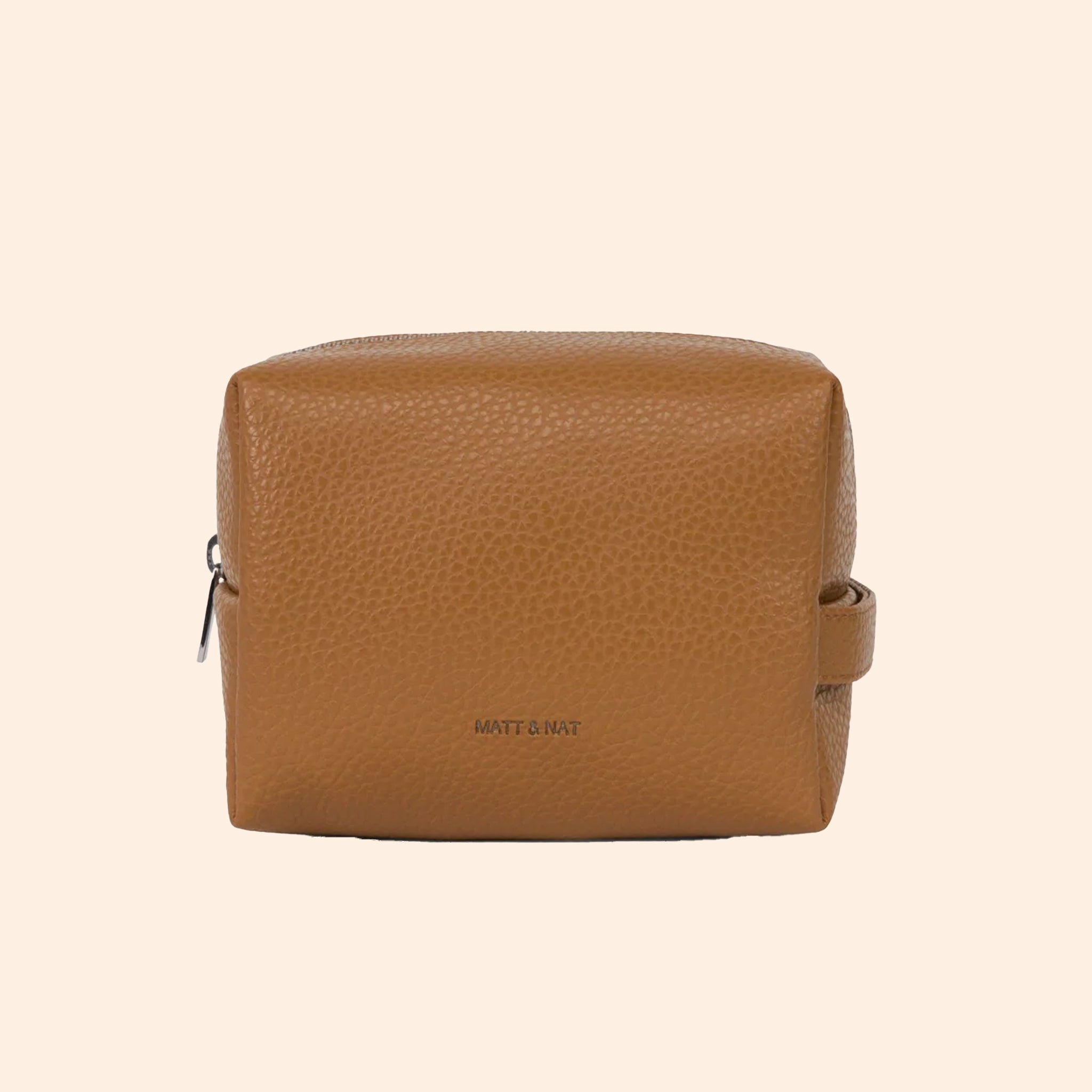 Introducing Matt & Nat's small Blair toiletry case with a top zipper closure and a handle on the right side in a warm brown shade. Get organized at home or for travel with this adorable toiletry case.