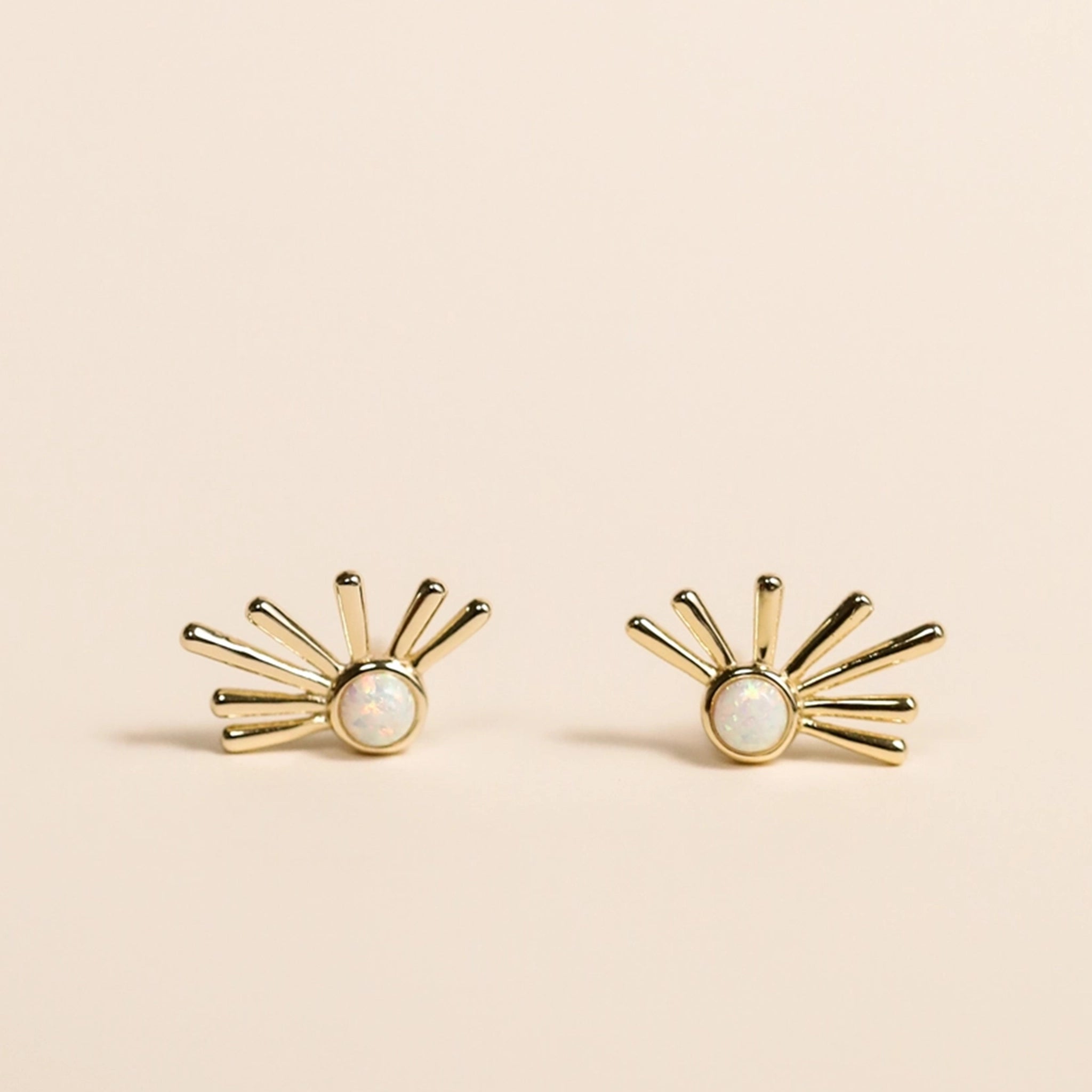 Bring the sun wherever you go with the stunning White Opal Sun Ray Stud Earrings from Jaxkelly. Their dainty design makes them perfect for adding to an existing stack or worn alone.