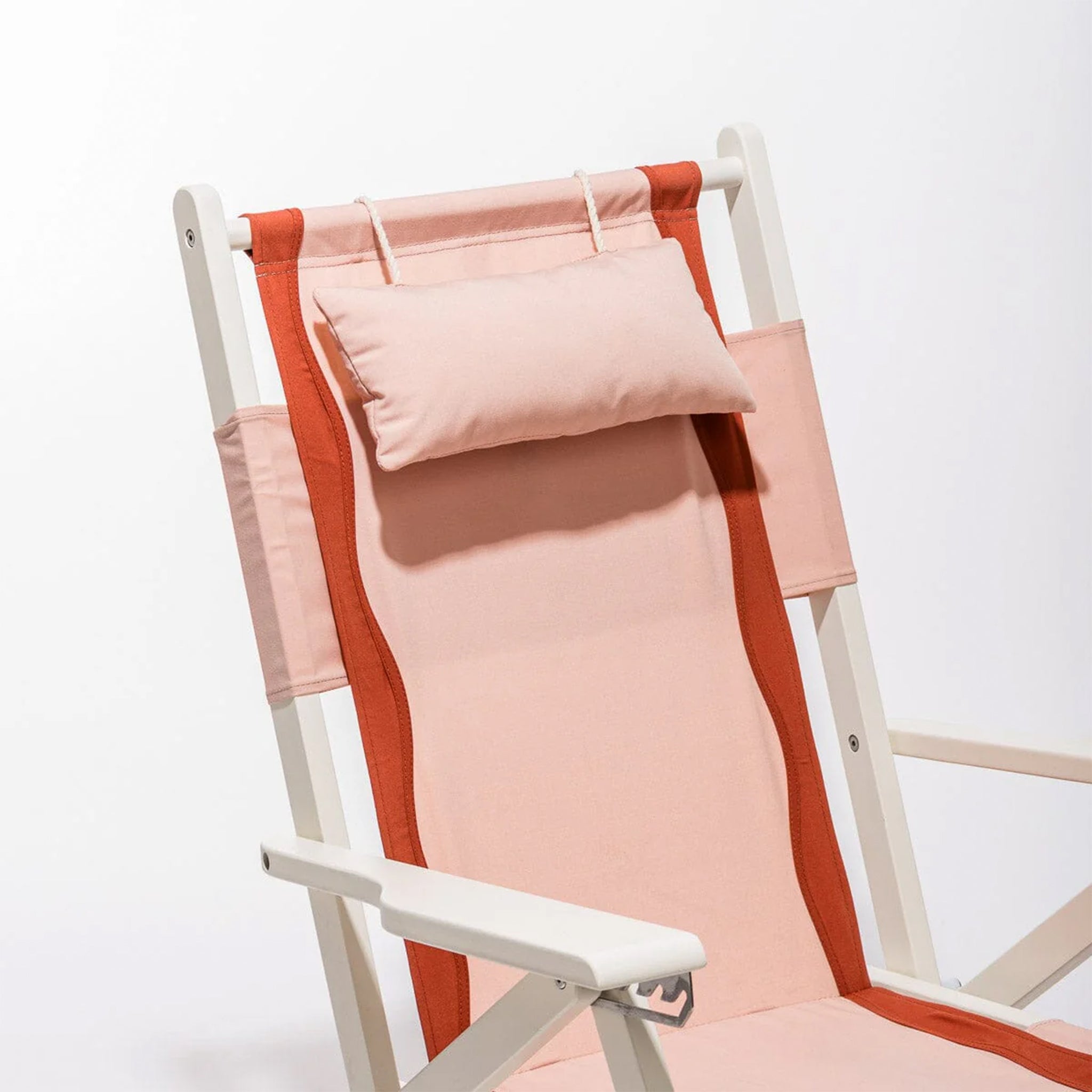 Meet Business & Pleasure's practical yet beautiful Tommy Chair in the shade Pink and White Rivie. The Tommy Chair is designed to bring all the style and comfort you could want to the beach on your back! This 5 position reclining beach chair with large back zip pocket, armrests and soft touch outdoor canvas sling all folds up into a backpack!