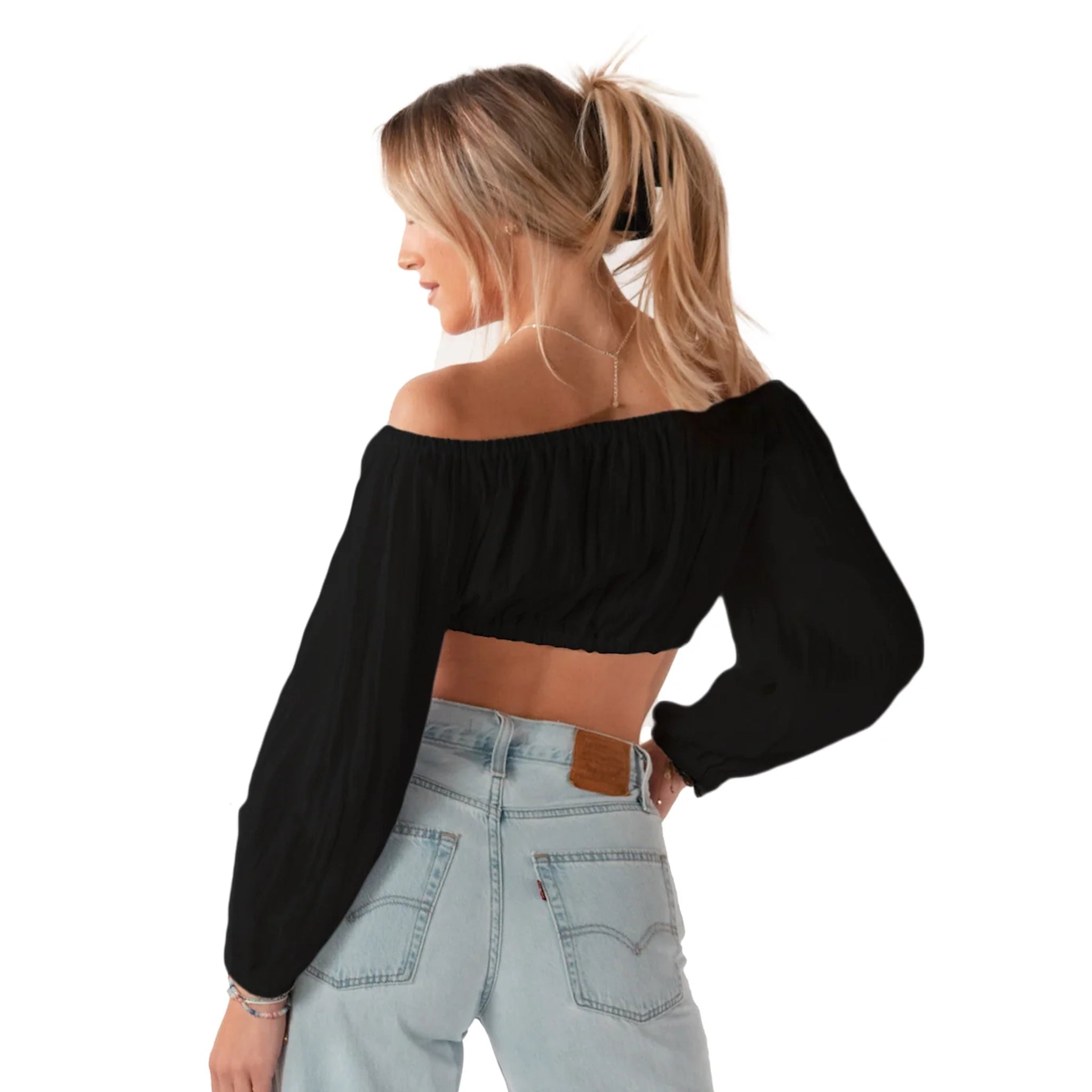Say hello to the new off-the-shoulder crop top in the shade black. This trendy top features long sleeves and an alluring off-the-shoulder neckline. Made from comfortable cotton fabric, it's perfect for every fashion-forward occasion. Pair it with the high-waisted, wide leg bottoms on our site for a complete look.