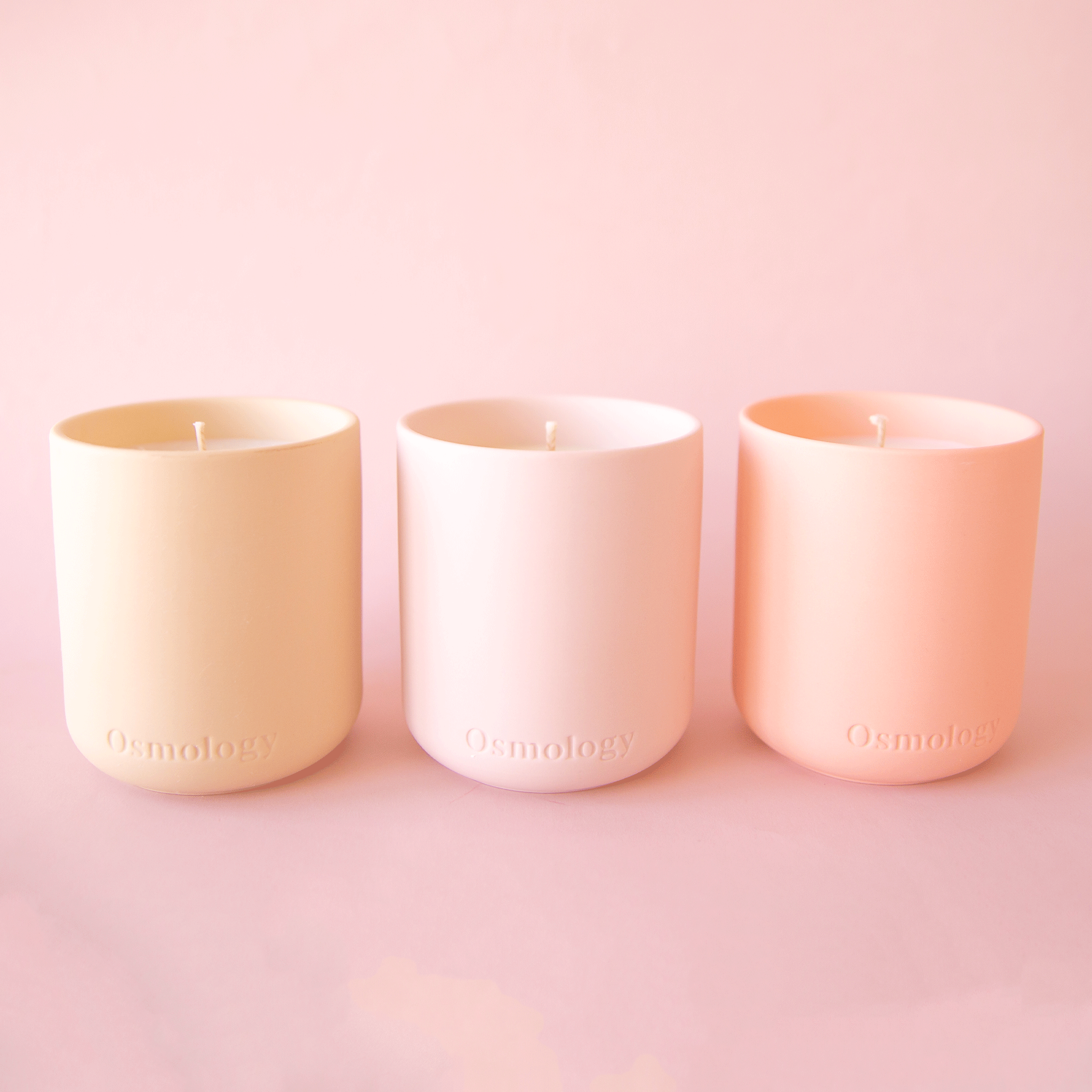 On an ivory background is three different sized vintage white ceramic planters with a thick fluting detail and a tapered base.