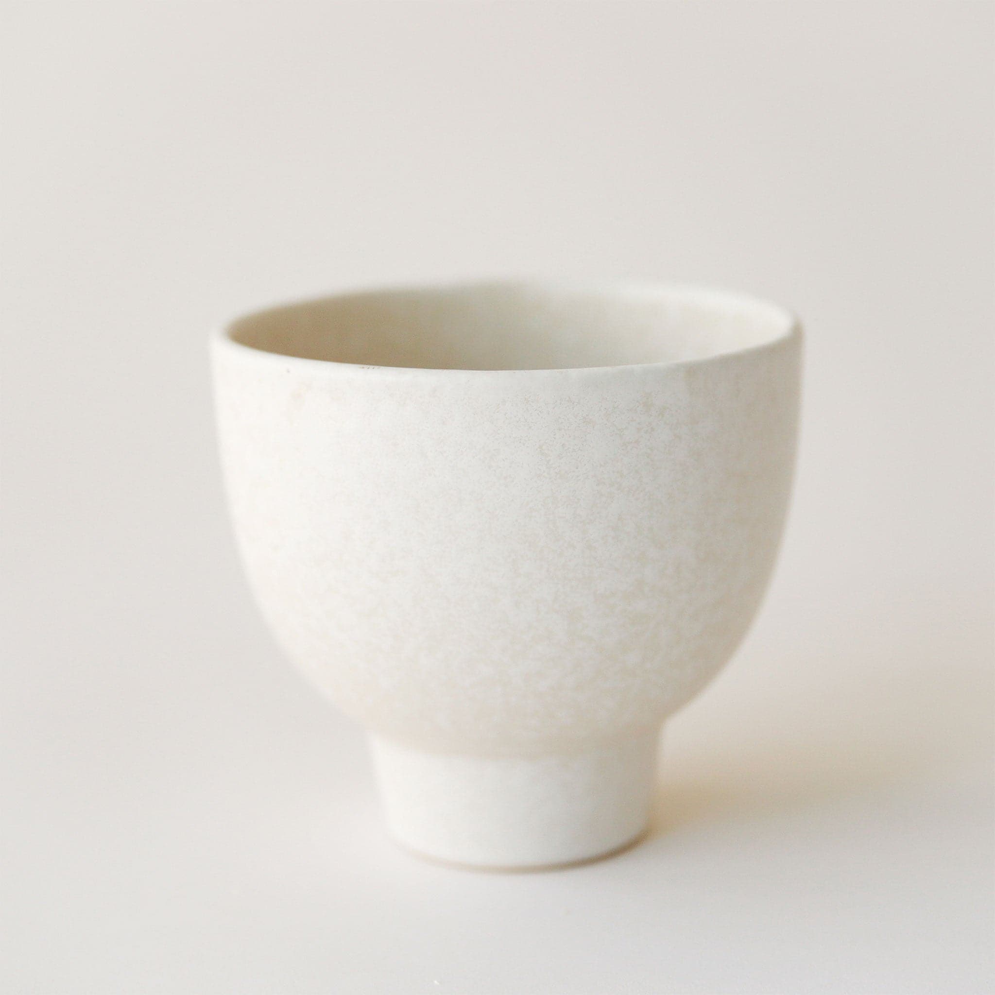 On a tan background is a pink ceramic ribbed pedestal pot filled with cut flowers not included with purchase.