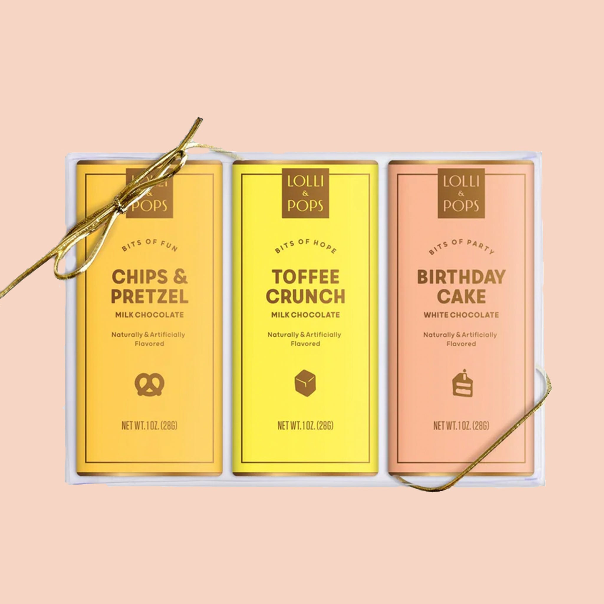 Enjoy a bit everything with this collection of favorite flavored chocolate bars including White Chocolate Birthday Cake, Milk Chocolate Chips and Pretzels, and Milk Chocolate Toffee Crunch.
