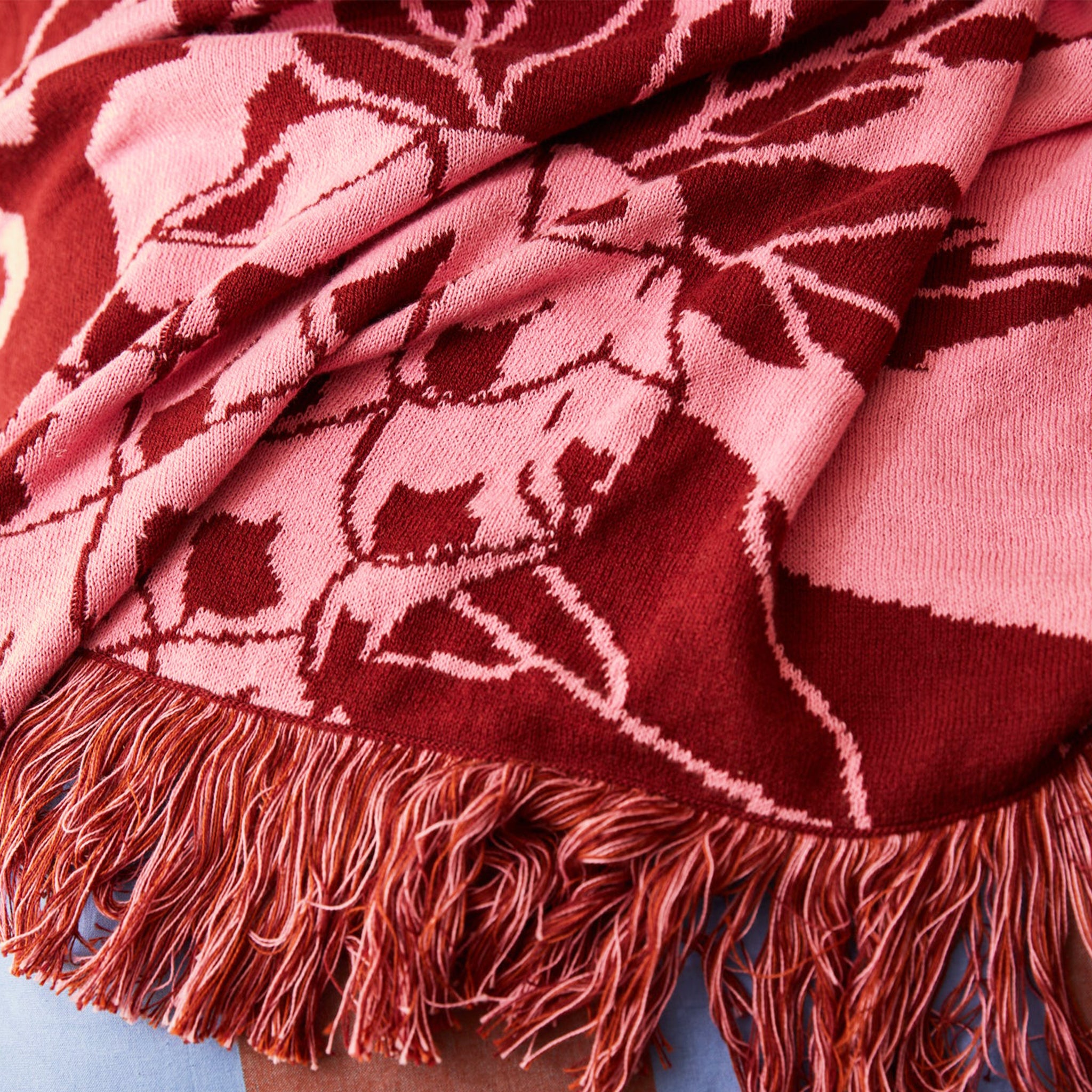 Snuggle up in the soft, cozy goodness of Sage + Clare's signature knit blanket. Style it over your couch or bed for that effortless, eclectic edge. The perfect pop of rust and pink for your space.