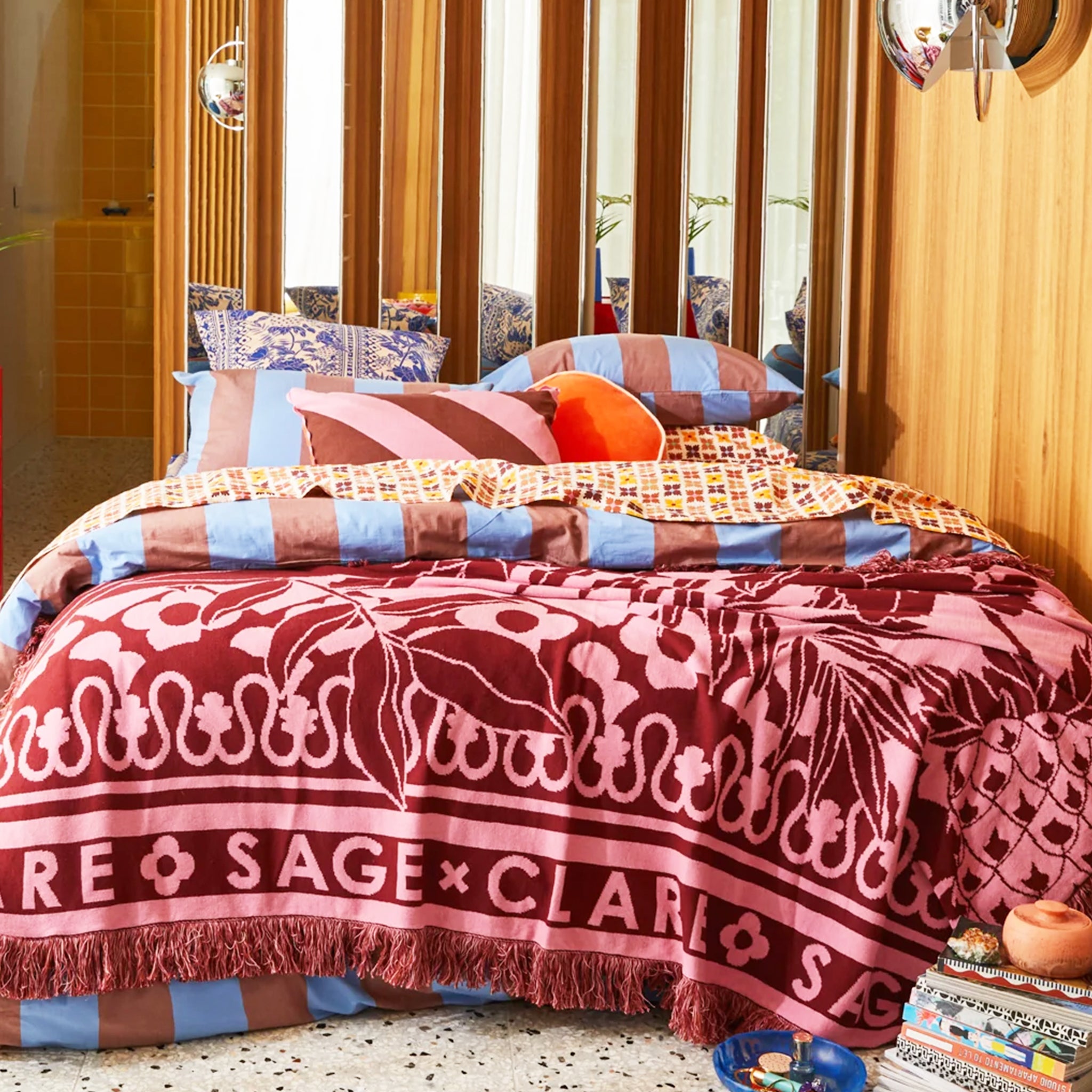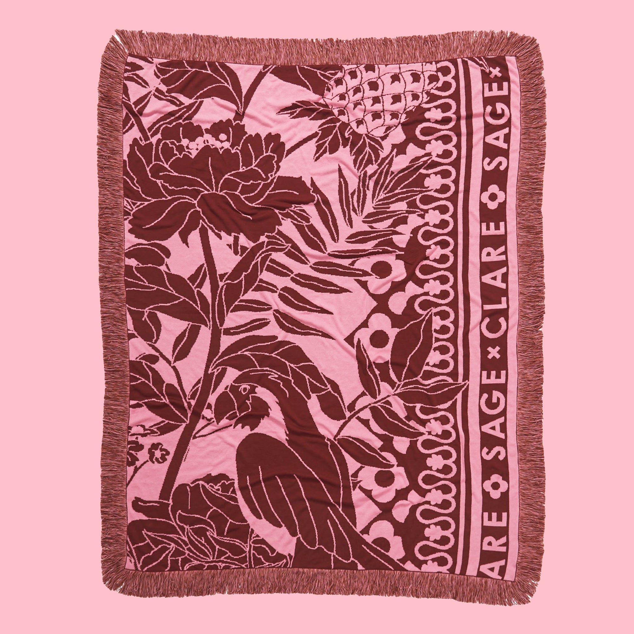 “Wrap yourself up in this ultra-soft jacquard knit blanket on cozy nights spent on the couch. Inspired by the vintage jungle wallpaper, the design features oh-so-subtle Sage x Clare branding and even a cheeky parrot, while a long fringe border adds a final touch of flair.” – Phoebe’s Style Notes