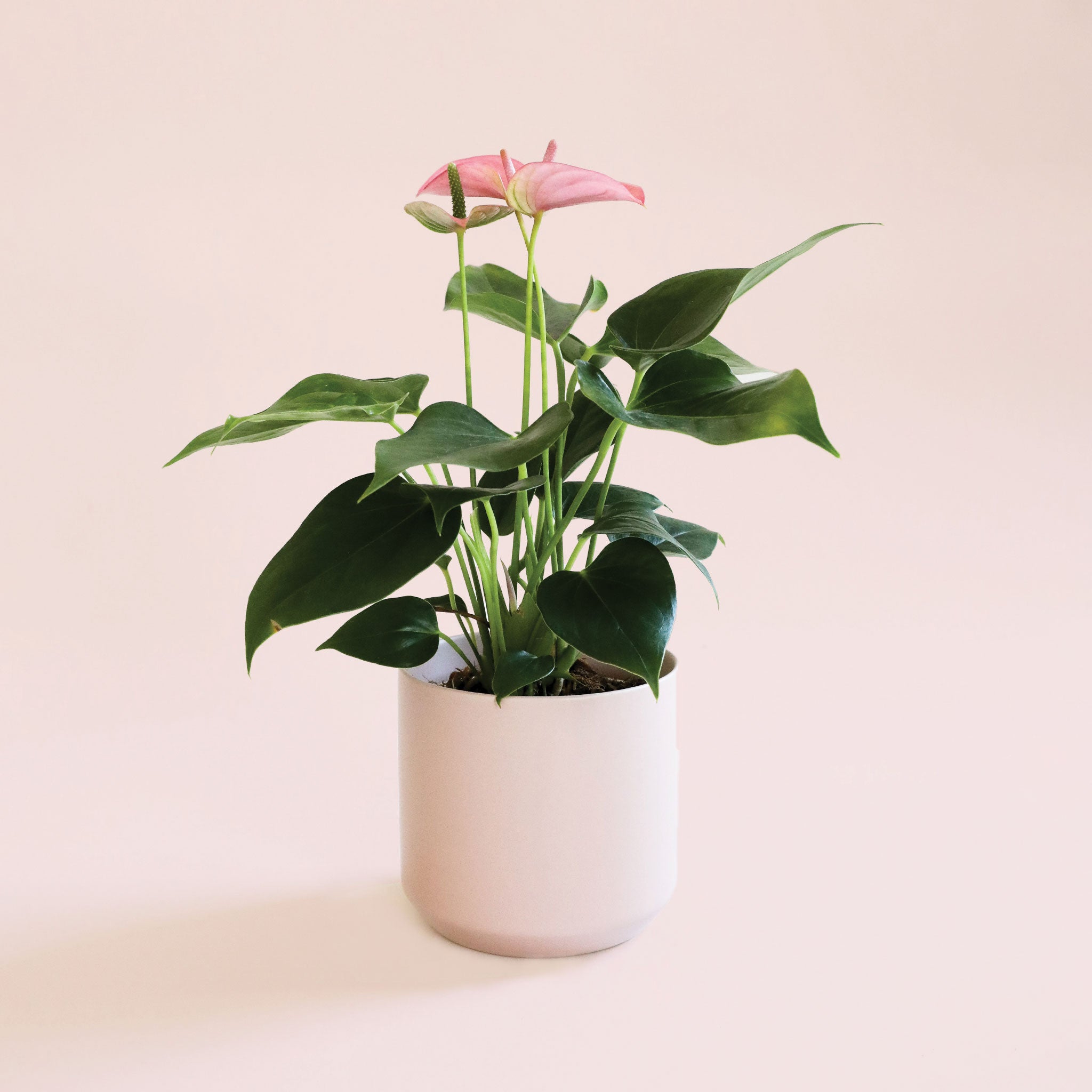 Anthurium Sweet Dreams feature deep green leaves with soft pink blooms.