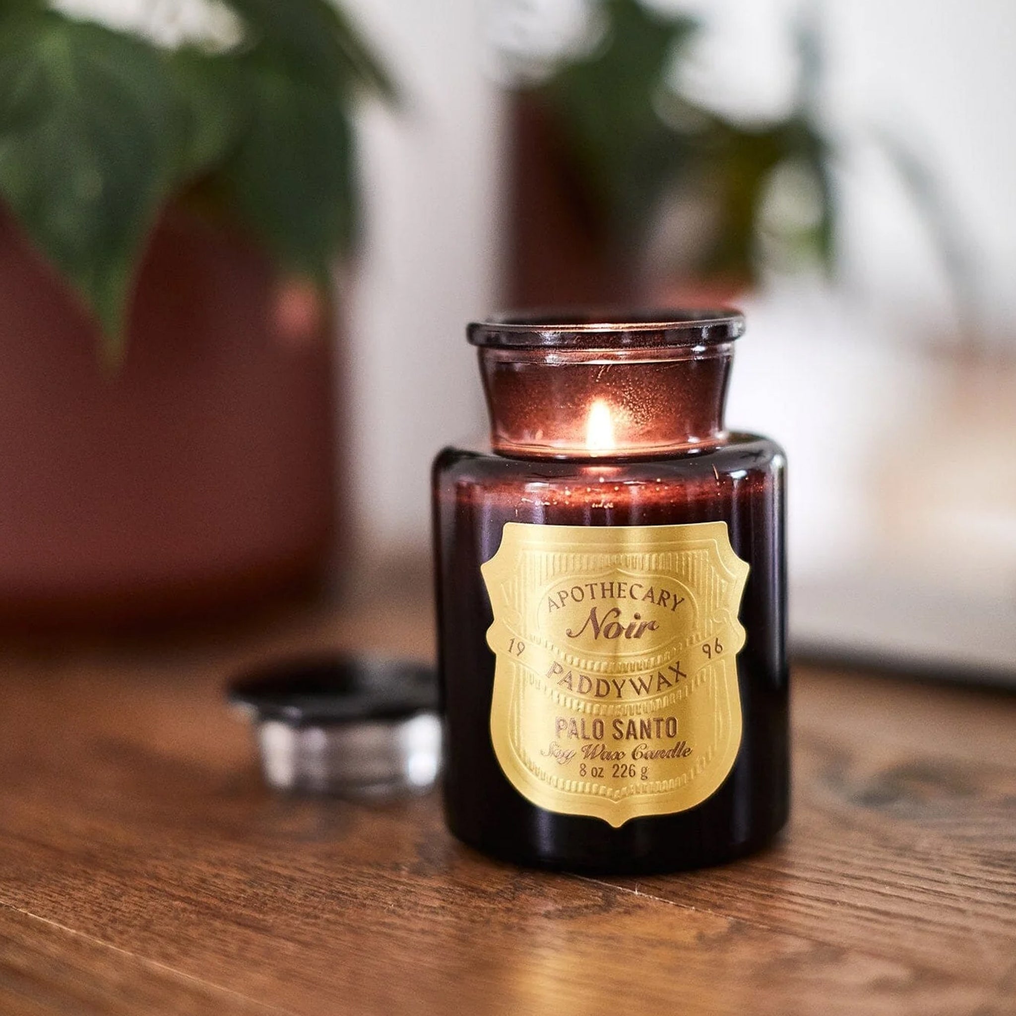 Introducing Apothecary Noir, a sophisticated take on Paddywax's bestselling candle. Featuring the same iconic shape of an old world apothecary bottle, Noir brings an extra dose of decadence with inky black tinted glass and embossed metallic labels. Enjoy the luxurious scent of Apothecary Noir - Palo Santo 8oz candle, designed to emit an amber glow to set the tone in your space.