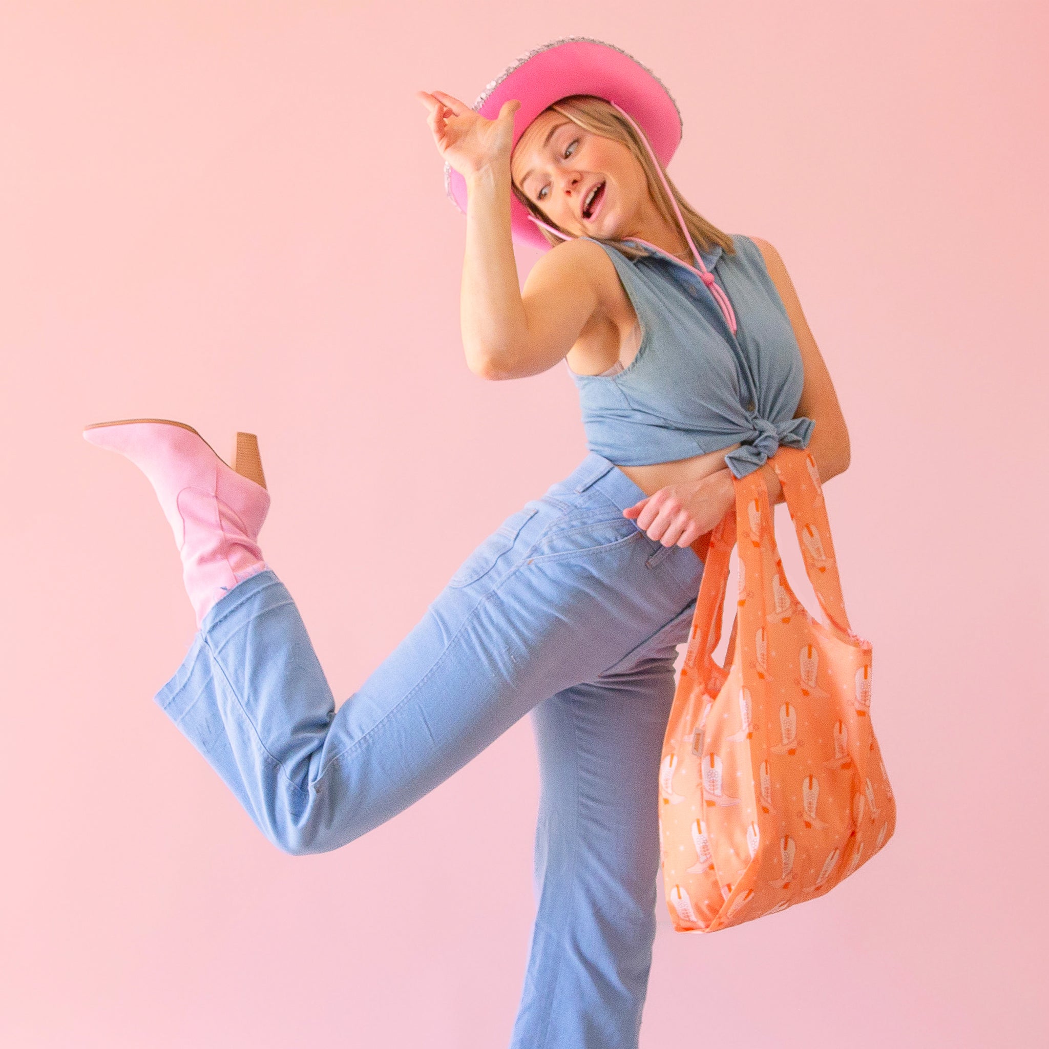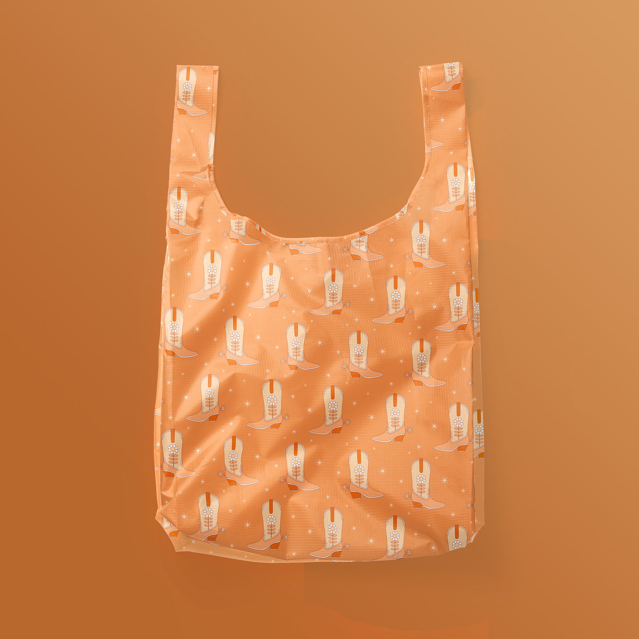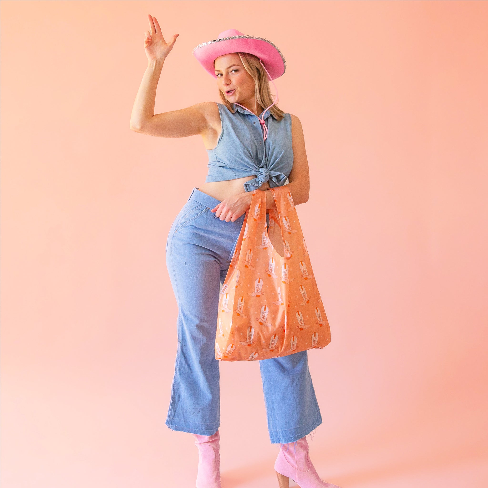 Say hello to your new must-have accessory for spring and summer - the Dolly Reusable Bag! With its vibrant orange hue and adorable cowboy boot print, this nylon bag is not only perfect for grocery trips and beach days, but makes an adorable everyday accessory. Ditch single use plastic and strut your stuff in style with the versatile and eye-catching Dolly Reusable Bag.
