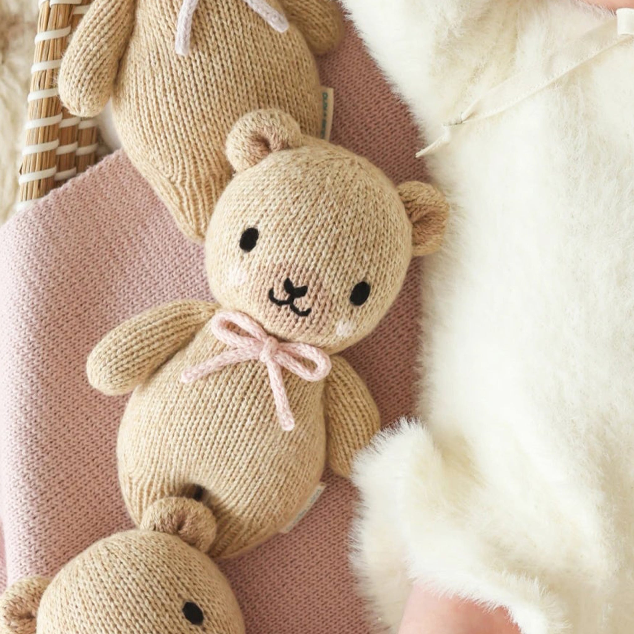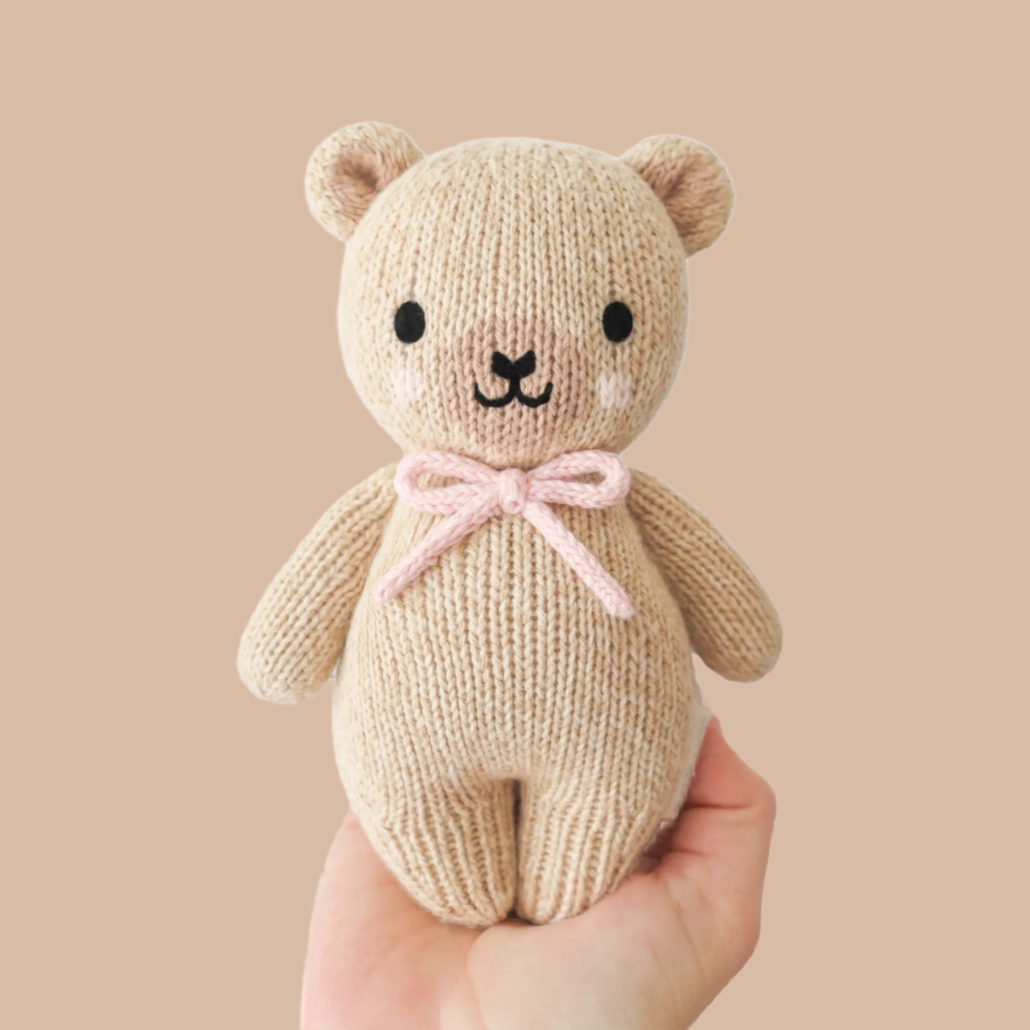 Meet Baby Honey Bear with a Blush Bow, a tiny hand-knit treasure crafted from soft, natural Peruvian cotton yarn. Just a bit bigger than your hand, this heirloom-quality companion is full of lovable charm and perfect for starting or growing your collection. With its sweet details and cuddly softness, Baby Honey Bear is sure to become a favorite collectible for all ages!