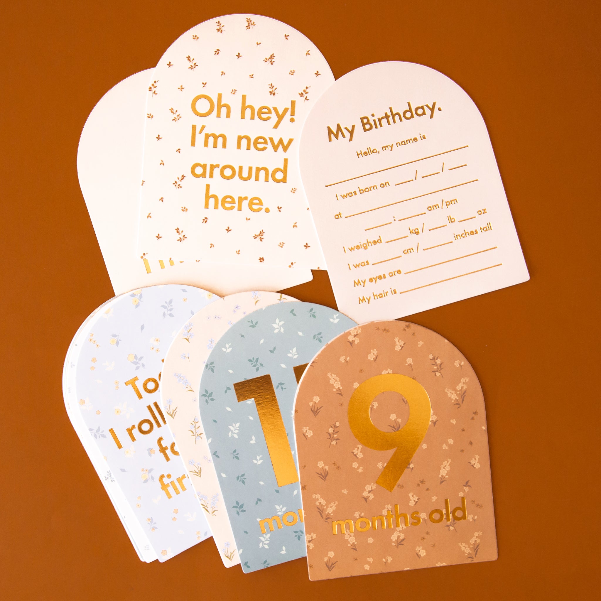 Includes special cards for your birth announcement and all the important milestones from one day old to one year old and beyond, all in pastel colors, sweet floral prints and stunning gold foil.