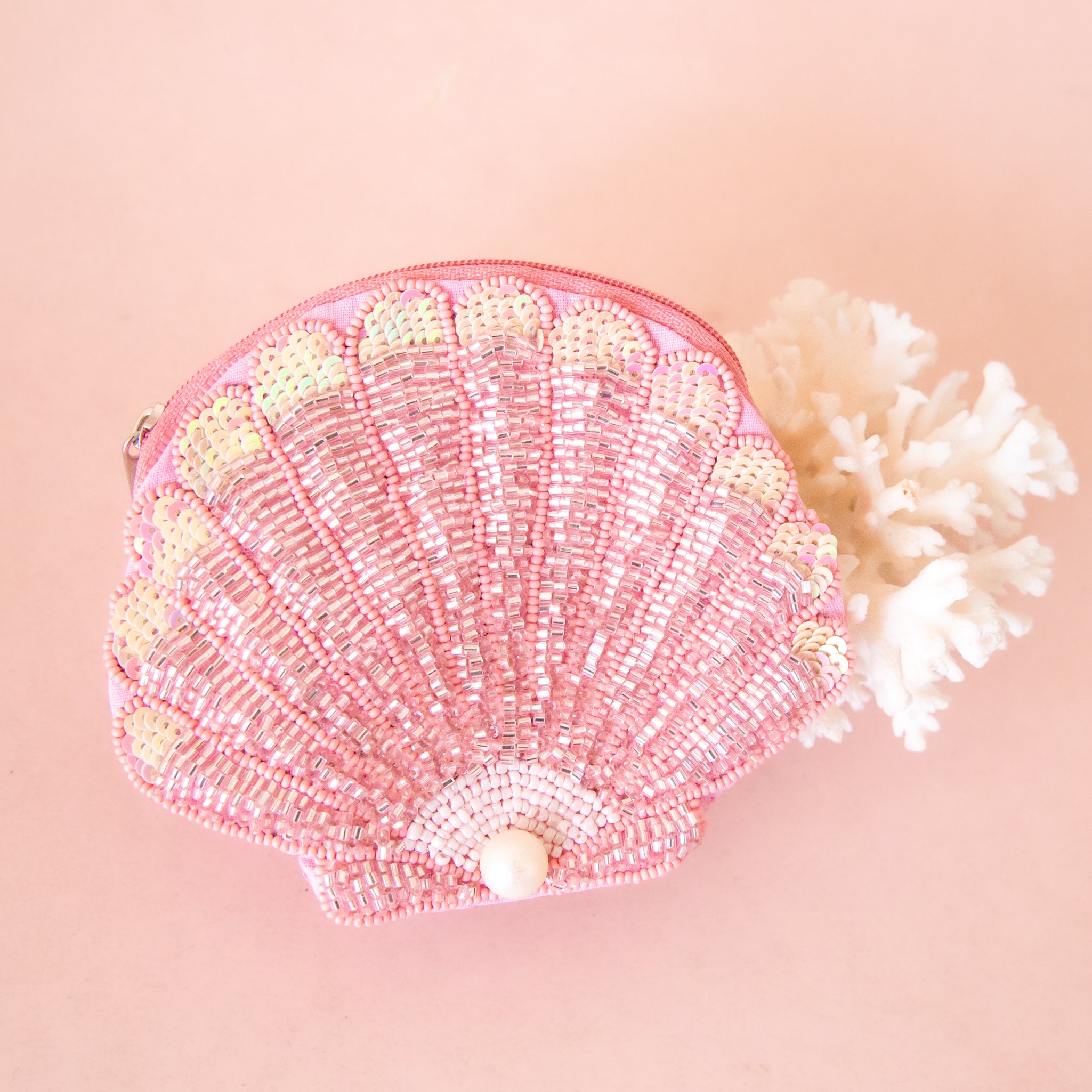 Add a splash of seaside charm with the Beaded Shell Pouch in dreamy pink! Hand-beaded with shimmering sequins and seed beads, this playful shell-shaped pouch features a delicate faux pearl accent and a compact zippered design. Perfect for holding coins, makeup, or little essentials, it brings a fun, coastal vibe to your everyday style.