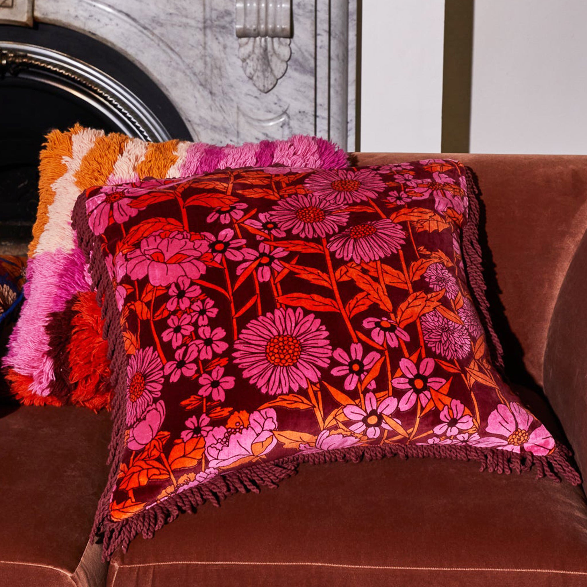 “Velvet is so effortlessly luxurious, beckoning to you to cuddle up and kick back. Combining that rich and relaxing softness with a floral print brings a bursting garden to life inside your home. Tonal fringing brings that extra touch of playful texture.” – Phoebe’s Style Notes