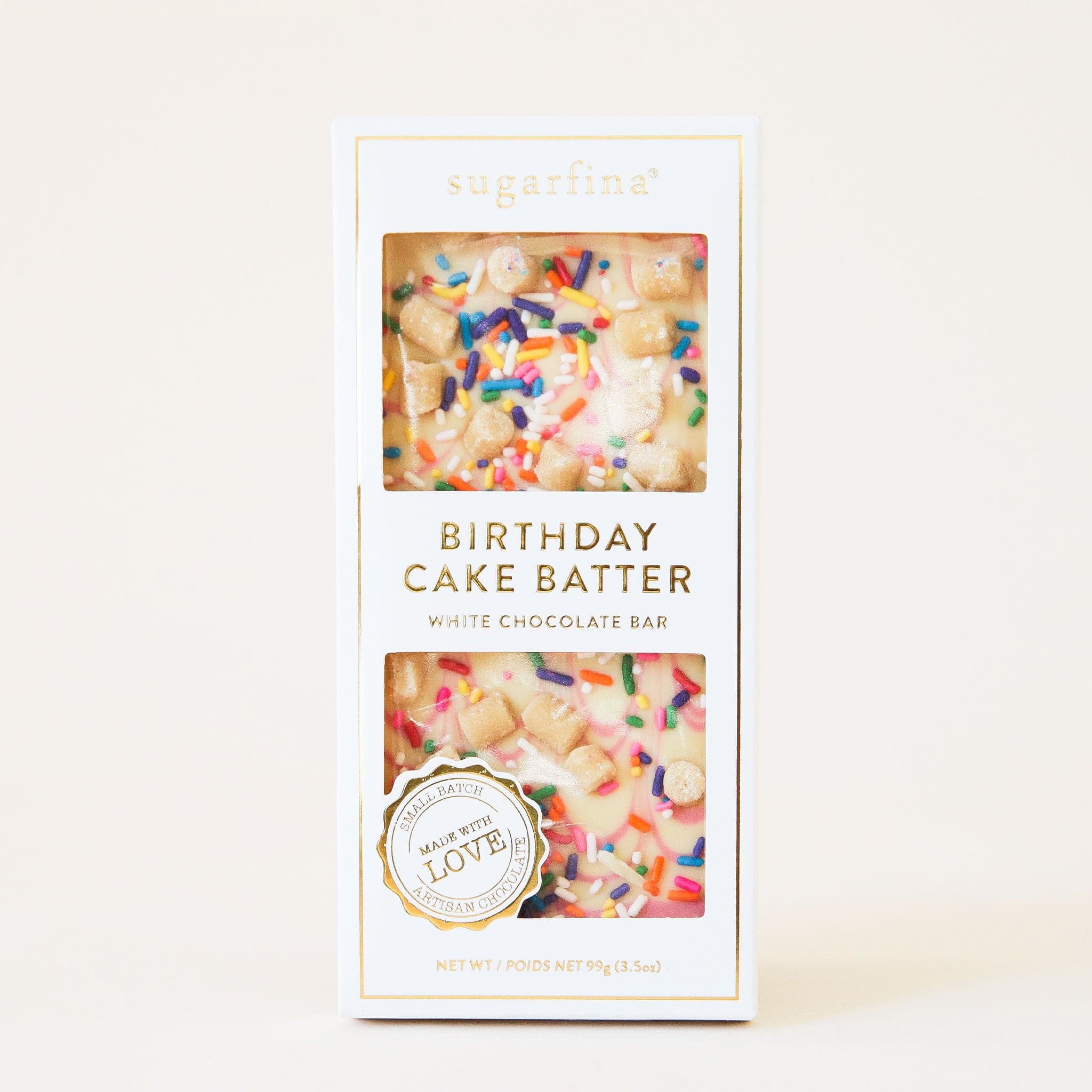 Sugarfina's decadent white chocolate bar is cake batter-flavored and confettied with rainbow sprinkles and rich, cake batter-flavored cookie dough crumbles. This is a celebration that really takes the cake!