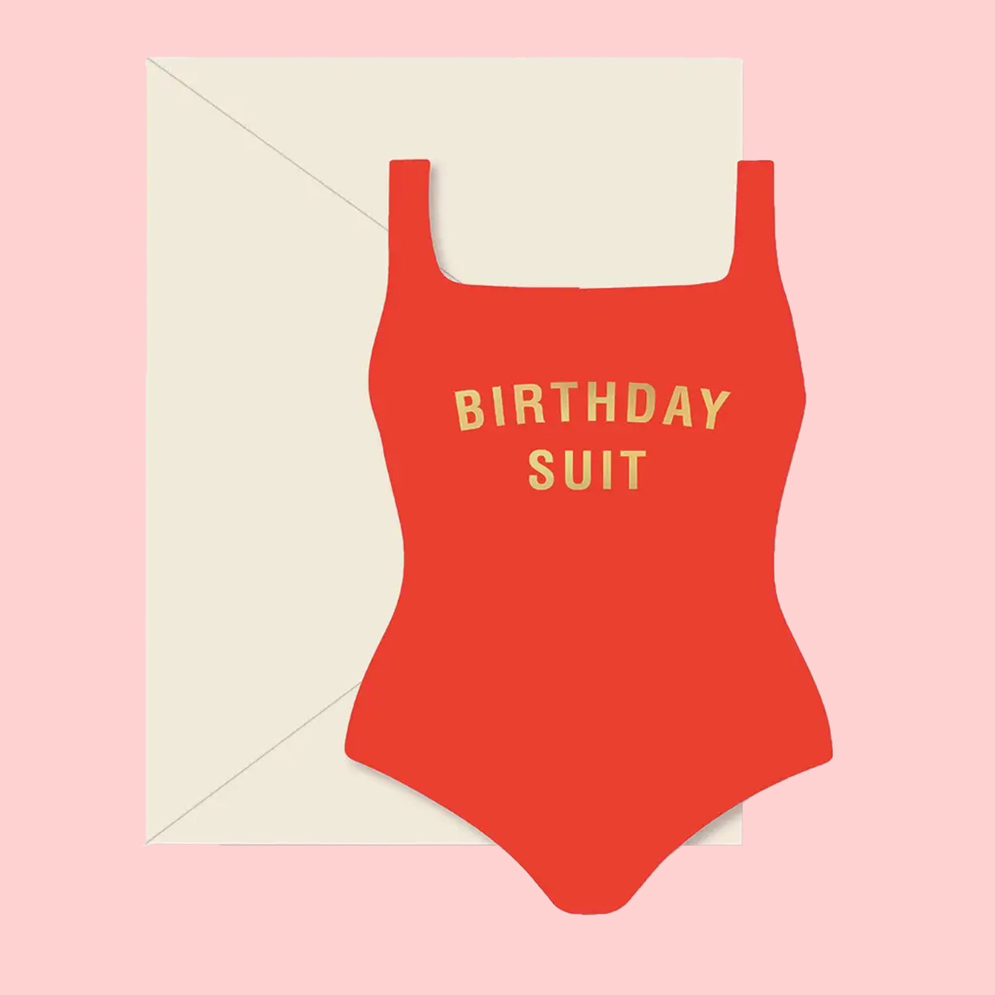 Celebrate another trip around the sun in style with our Birthday Suit Flat Card! Shaped like a bathing suit and adorned with gold foil text that reads "Birthday Suit", this card is sure to make the recipient smile. Inside is left blank for your personal message.