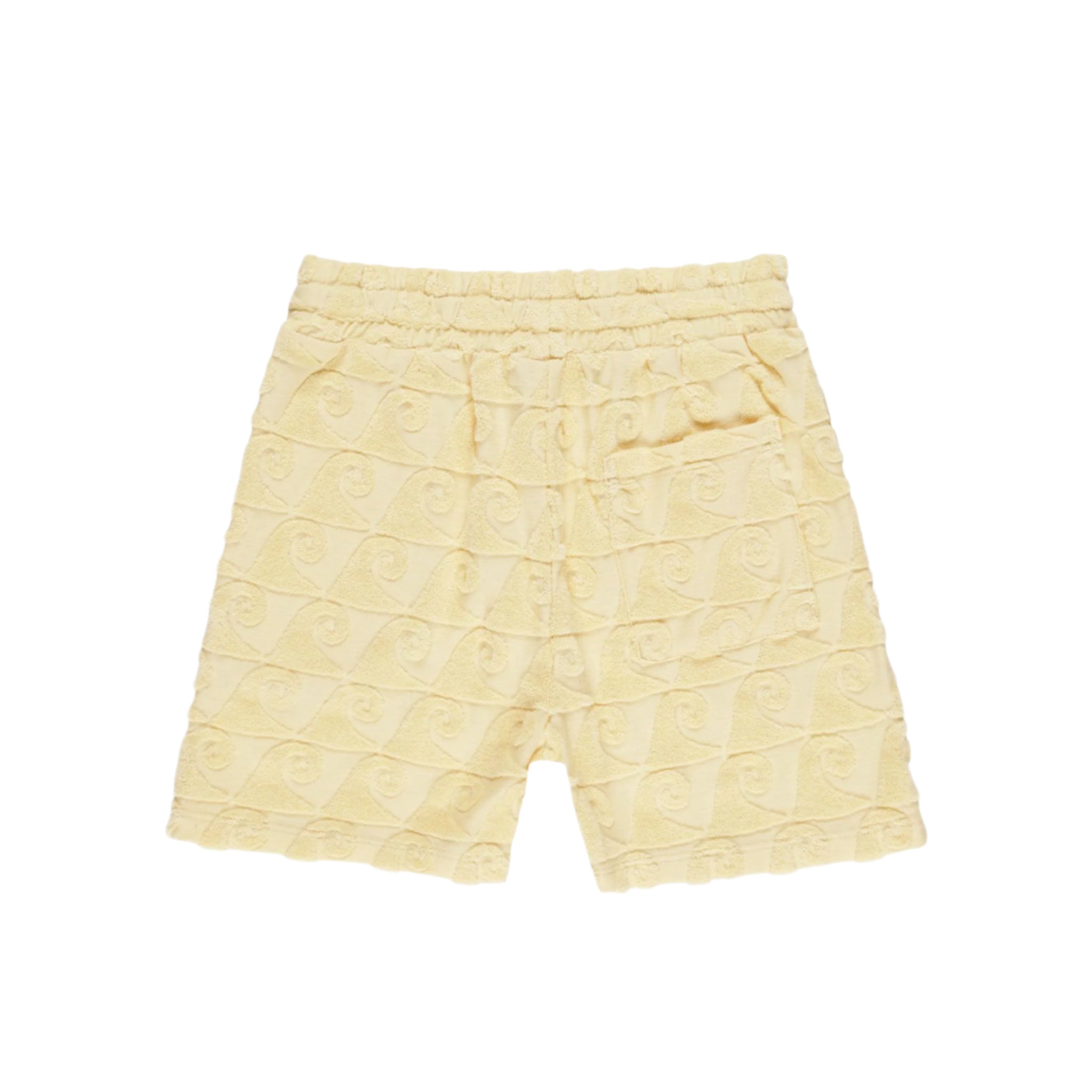 Introducing Rylee and Cru's new kids' board shorts, perfect for riding the waves in style! These light yellow shorts feature a subtle textured wave pattern that adds a touch of fun to any beach day.