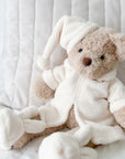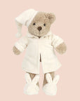 Briar Bedtime Bear, designed to be every child's perfect bedtime companion. The night cap adds a whimsical touch, while the robe ensures that Briar is always ready for a bedtime routine. But perhaps the most adorable feature of Briar Bedtime Bear is the pair of bunny plush slippers adorning its feet.