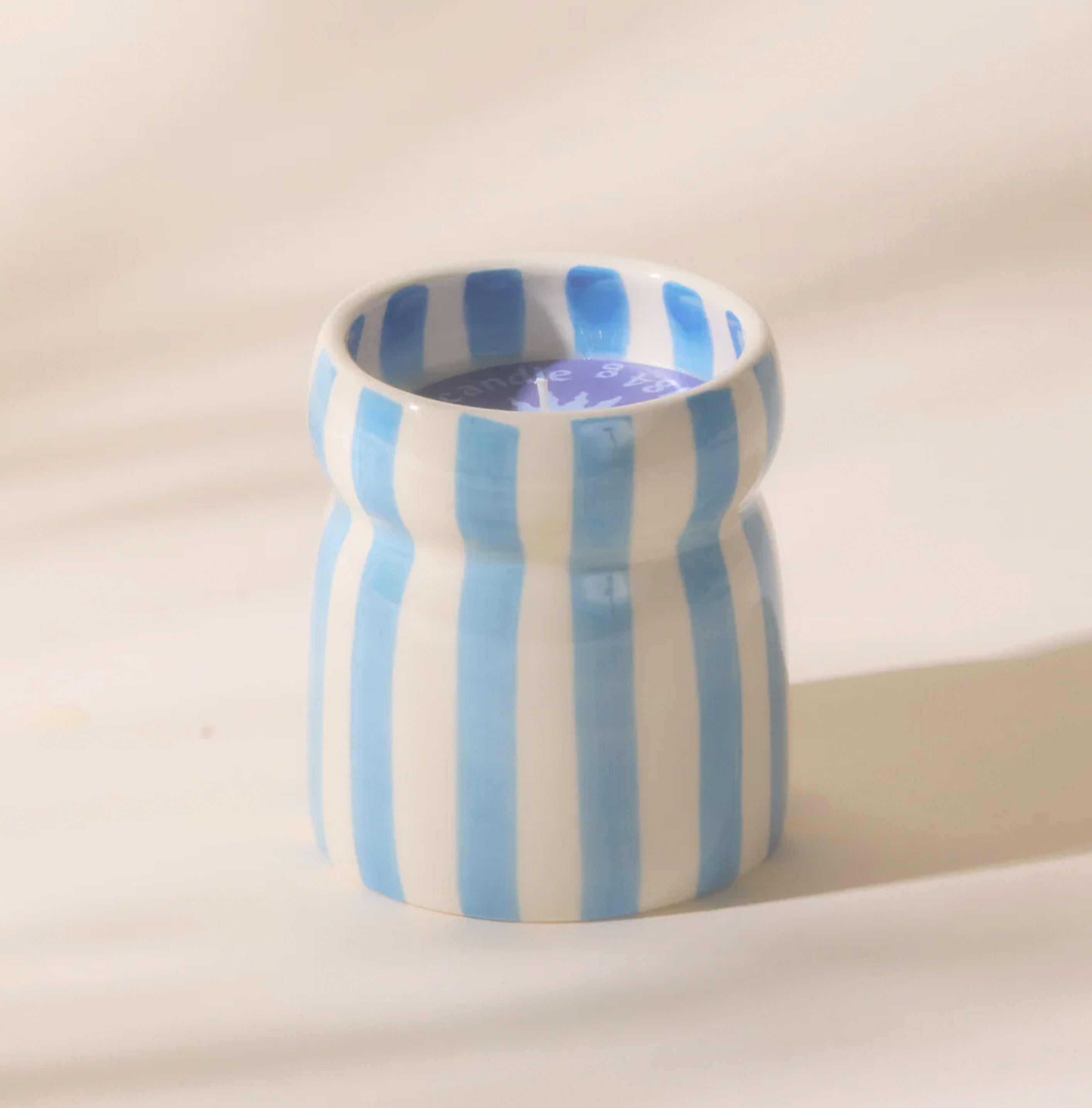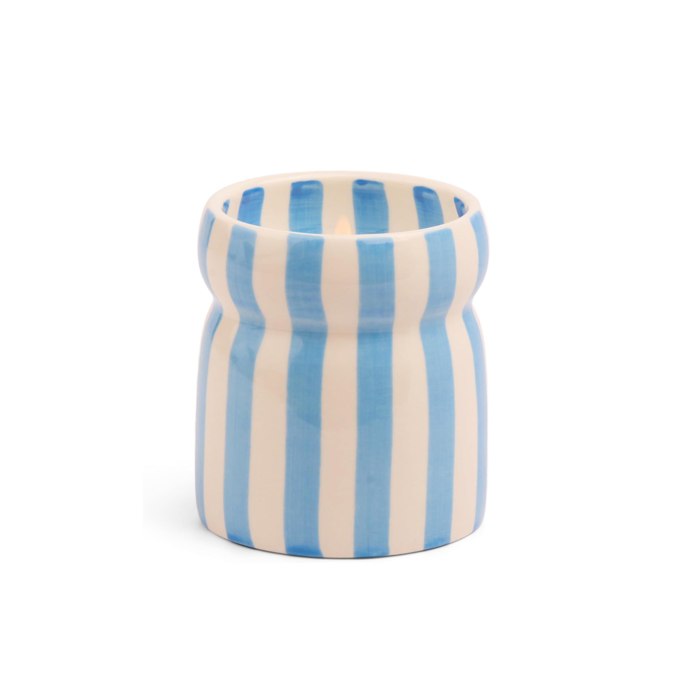 Escape to stunning shorelines with the Cabana Candle, crafted to capture the calming, refreshing aromas of seaside getaways. These hand-painted candles, inspired by colorful striped umbrellas, come in a fun pinched shape and just the right size. Once the candle is finished, the food-safe ceramic container is perfect for whipping up tasty treats or adding a cute touch to your decor!