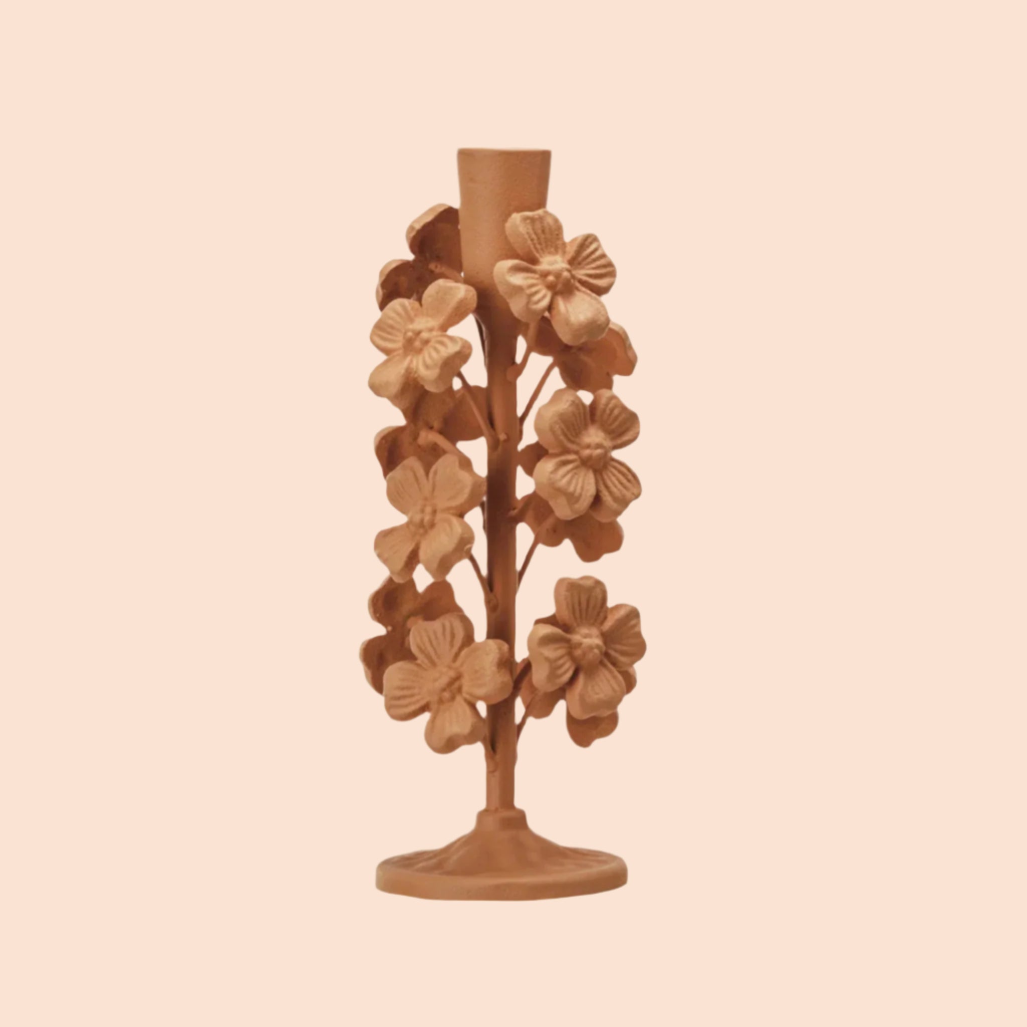 Elevate the ambiance of any room with the stunning Cast Iron Flowers Taper Holder in Apricot. The intricate floral design not only adds a touch of elegance, but also provides a sturdy base for your favorite candles. Create a warm and inviting atmosphere with this beautiful and functional piece.