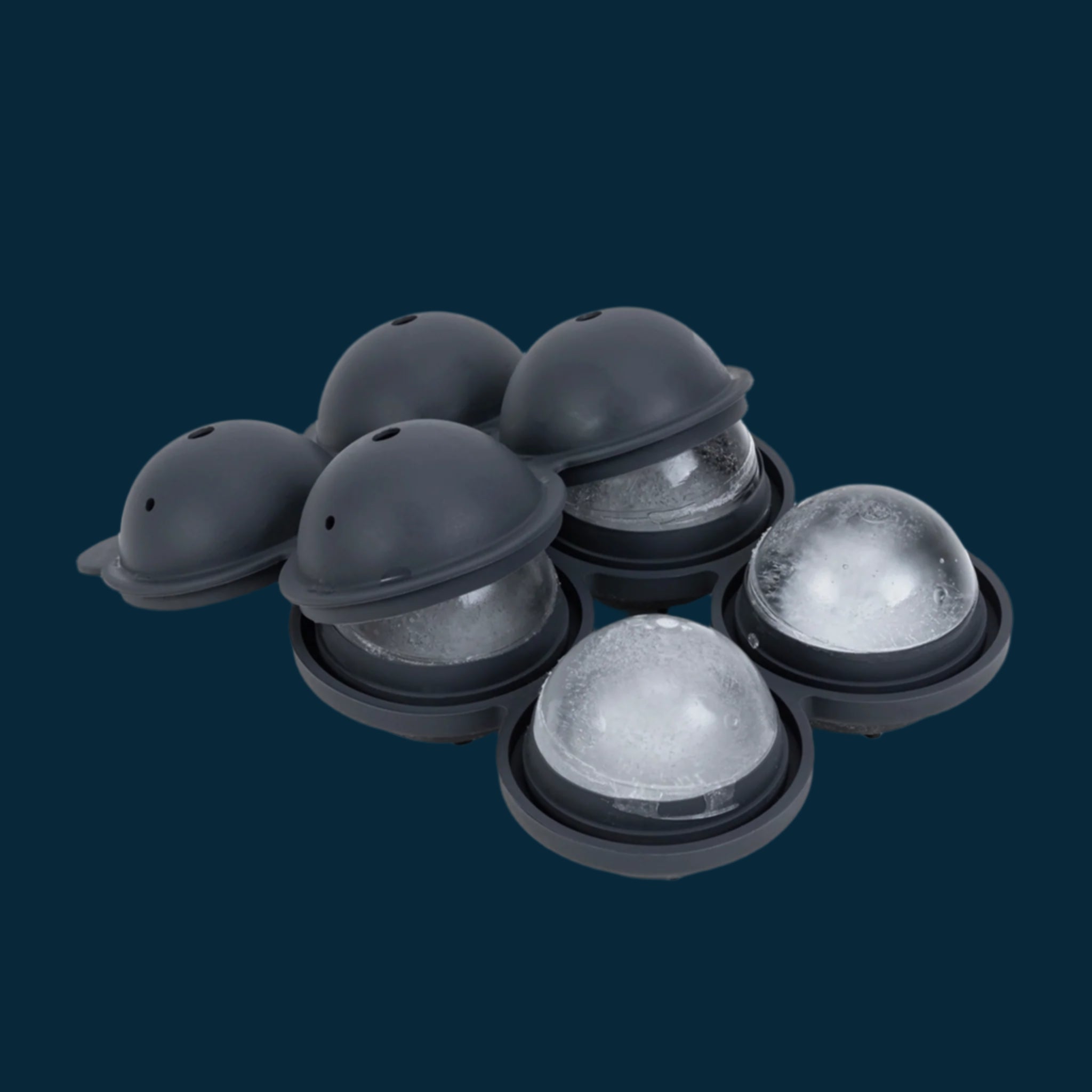 This tray makes four large ice spheres, ideal for the slow dilution of stiff cocktails. The design features sloped internal molds to create seamless spheres and rigid connecting pins secure the tray during filling, transfer and freezing.