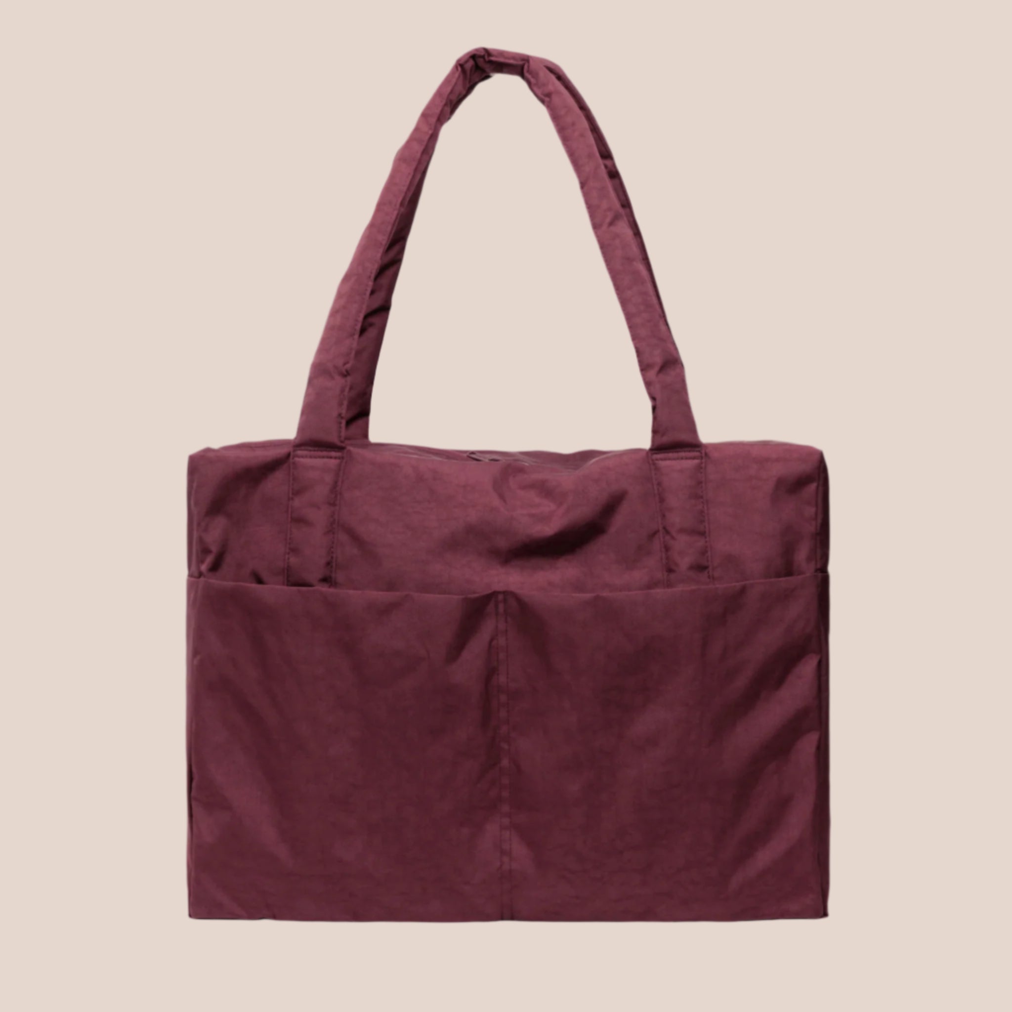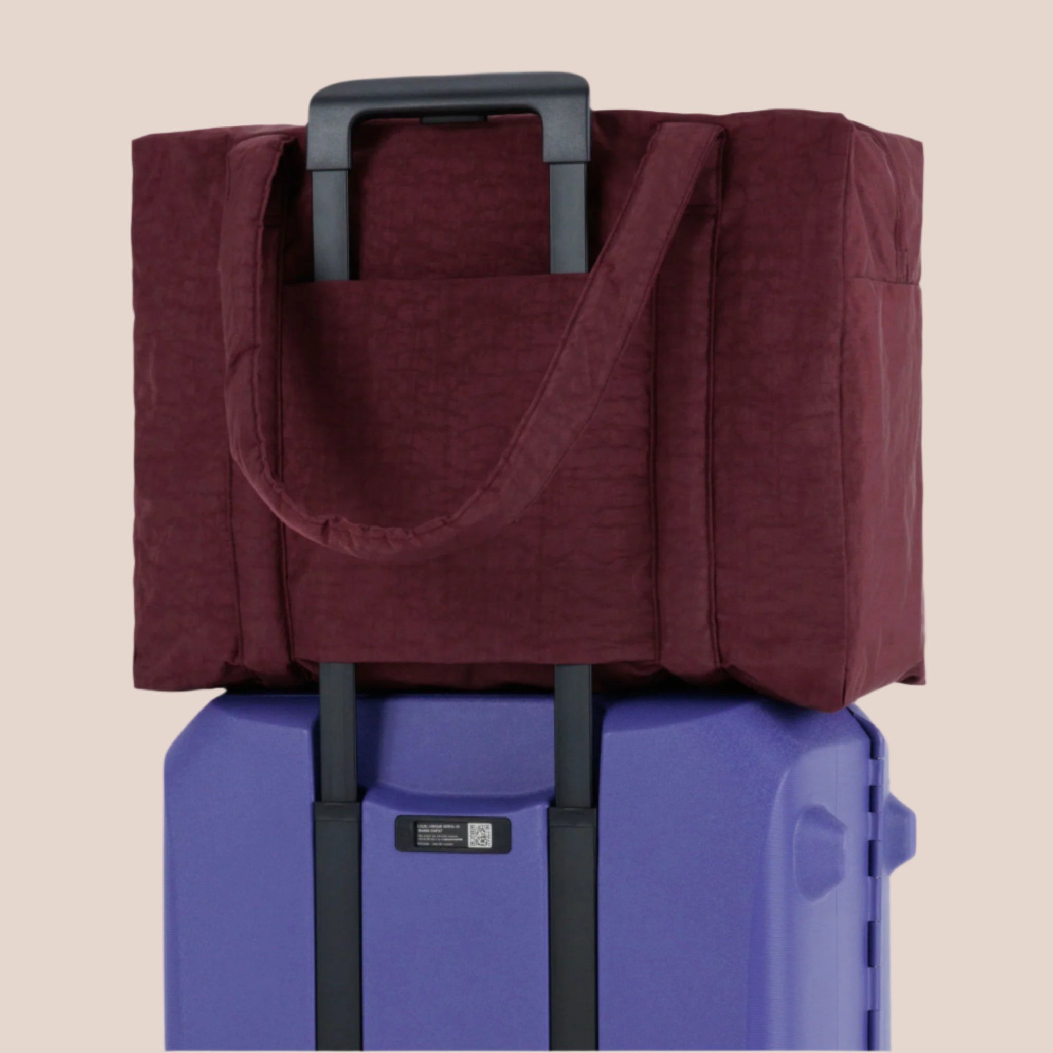Baggu's Cloud Carry-On in the shade Mahogany is the bag to help you float away for a weekend… and maybe then some. It fits everything you need for a weekend away, happily rides on your roll-aboard, stuffs easily into an overhead bin. Take it on a trip, or let it take you on one. Now in a gorgeous deep red color, perfect for adding a pop of color to your travel essentials.