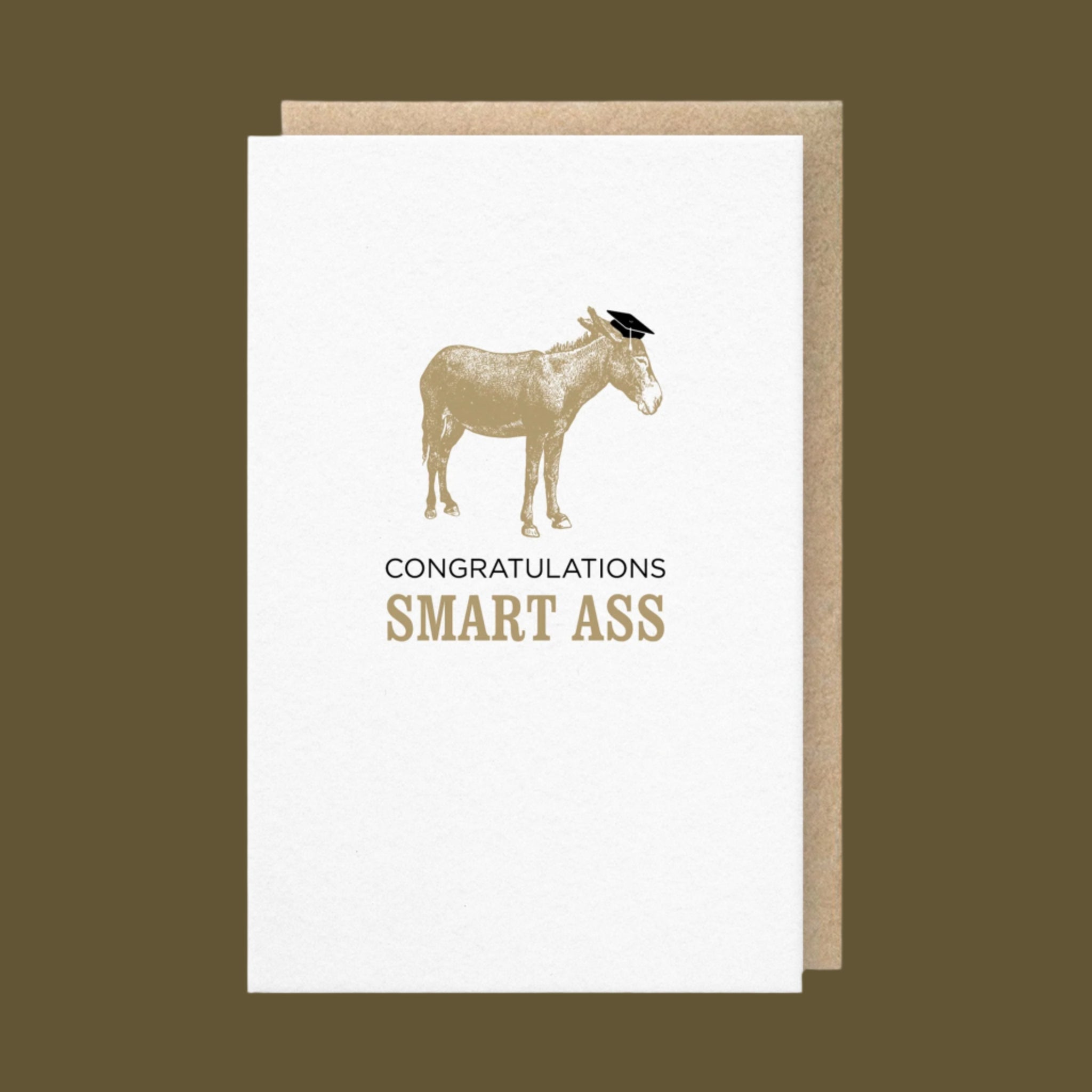 Celebrate your loved ones' achievements with Congrats Smart Ass! This quirky, punny greeting card features a donkey and is perfect for congratulating them on their success. Show your support and share a laugh with this fun and unique card.