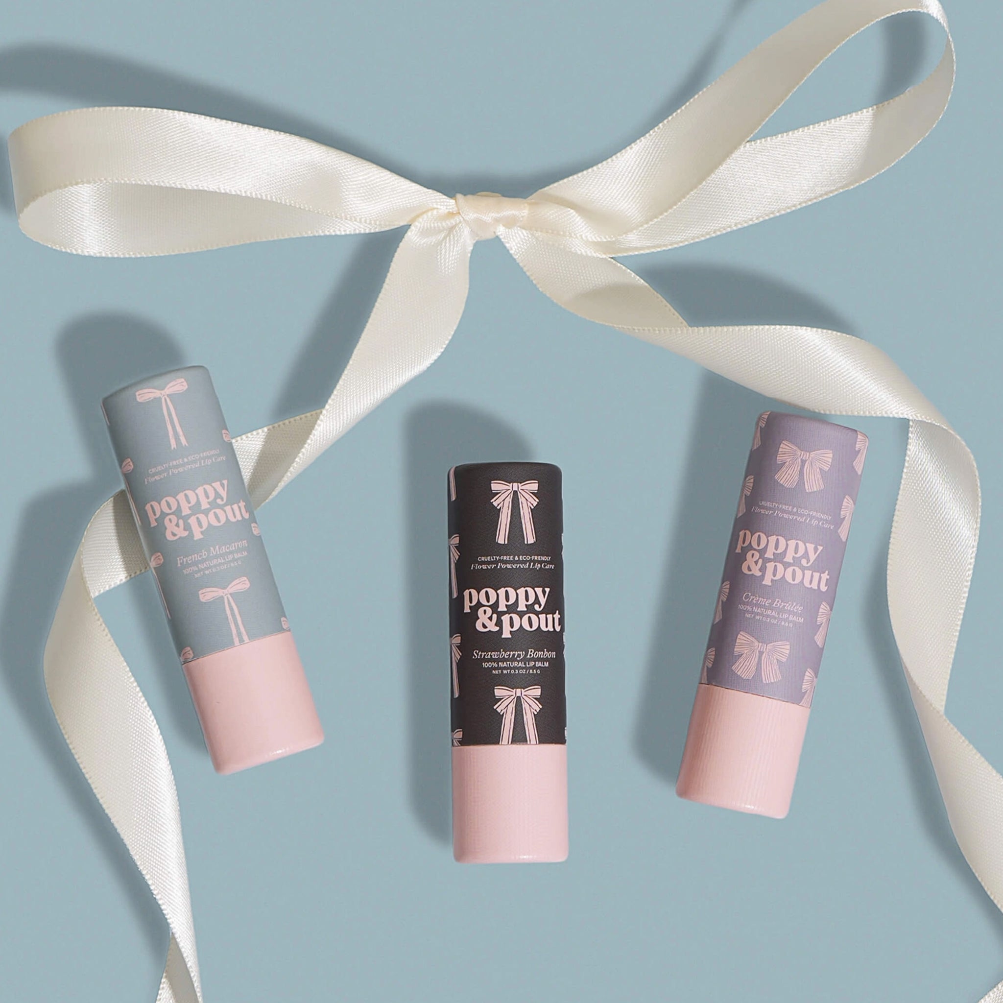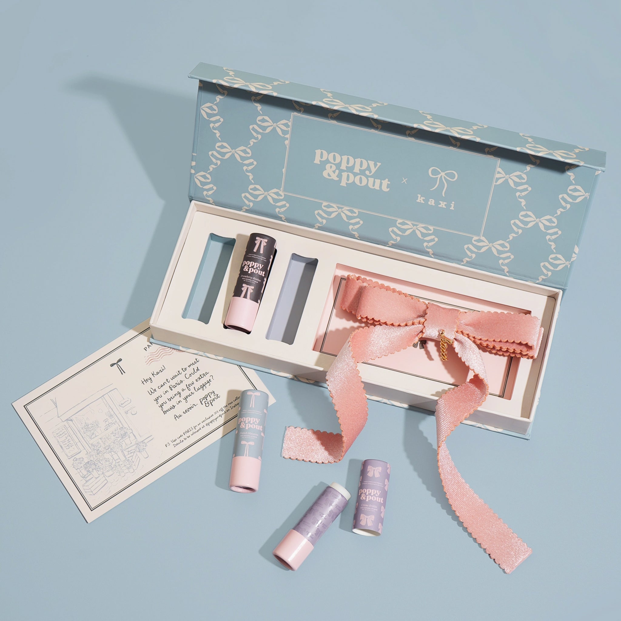 Enjoy Poppy & Pout's limited edition gift set collaboration with Kaxi. This custom gift set features 3 lip balms: French Macaron, Strawberry Bonbon, and Crème Brûlée as well as a custom pink velvet Kaxi hair bow. Give as a gift or treat yourself this holiday season!