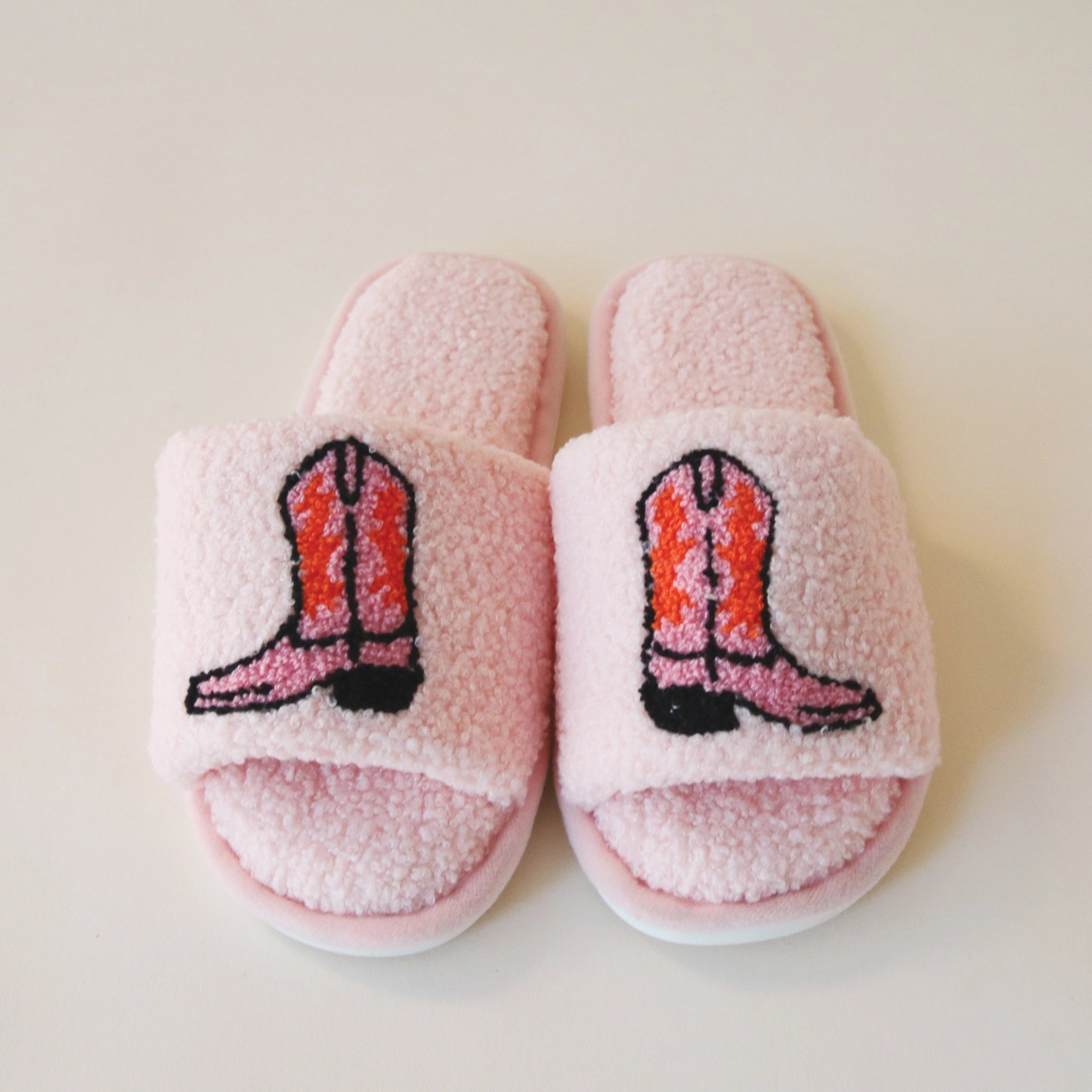The Cowgirl Slide Slippers perfect for getting cozy, lounging or running errands with their non-slip rubber bottoms featuring a fun cowgirl boot graphic and plush sole!