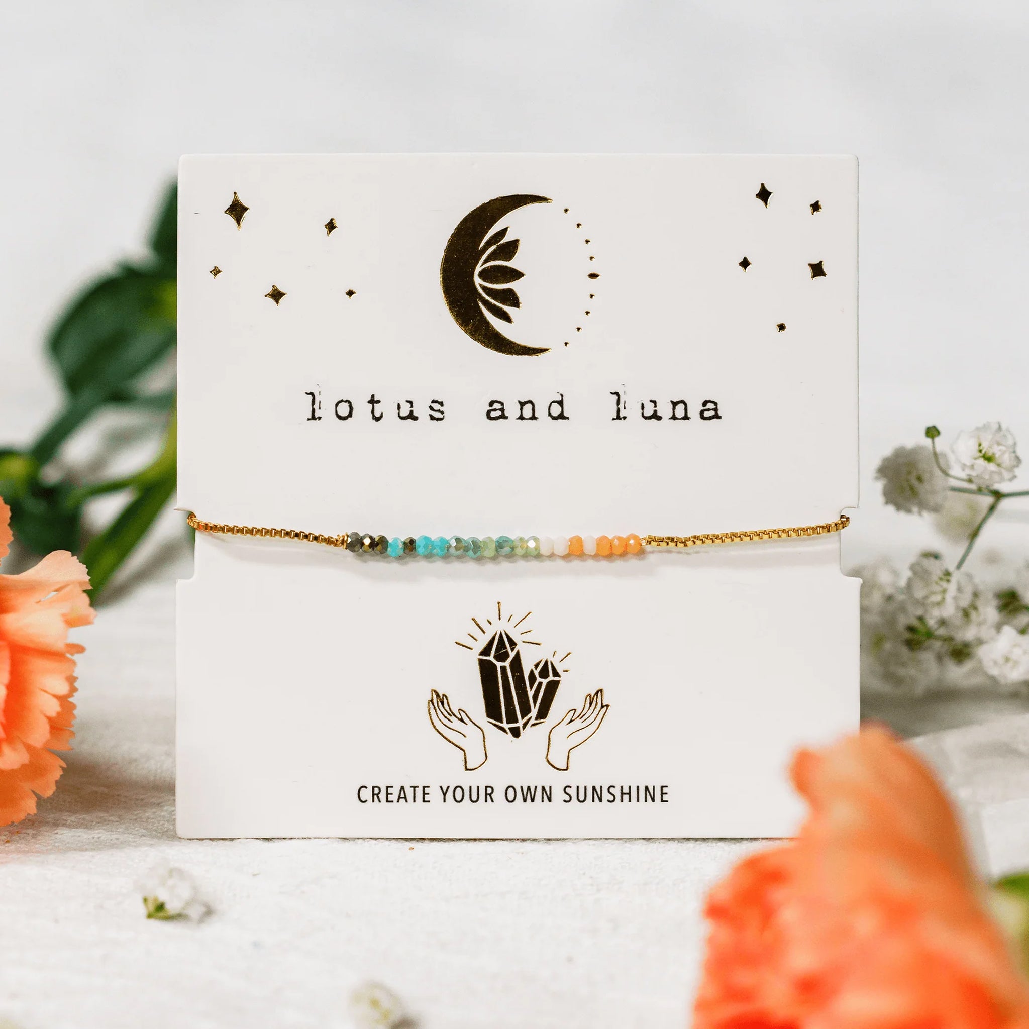 Lotus & Luna's Goddess Collection is designed to inspire an awakening of the Goddess within us all. Each piece is thoughtfully packaged on a card with its uplifting mantra, making it the perfect gift for inspiring and empowering. Wear this stunning multi-colored beaded bracelet as a reminder of your affirmation. Repeat these words to yourself to create positive change and embody Goddess-like energy.