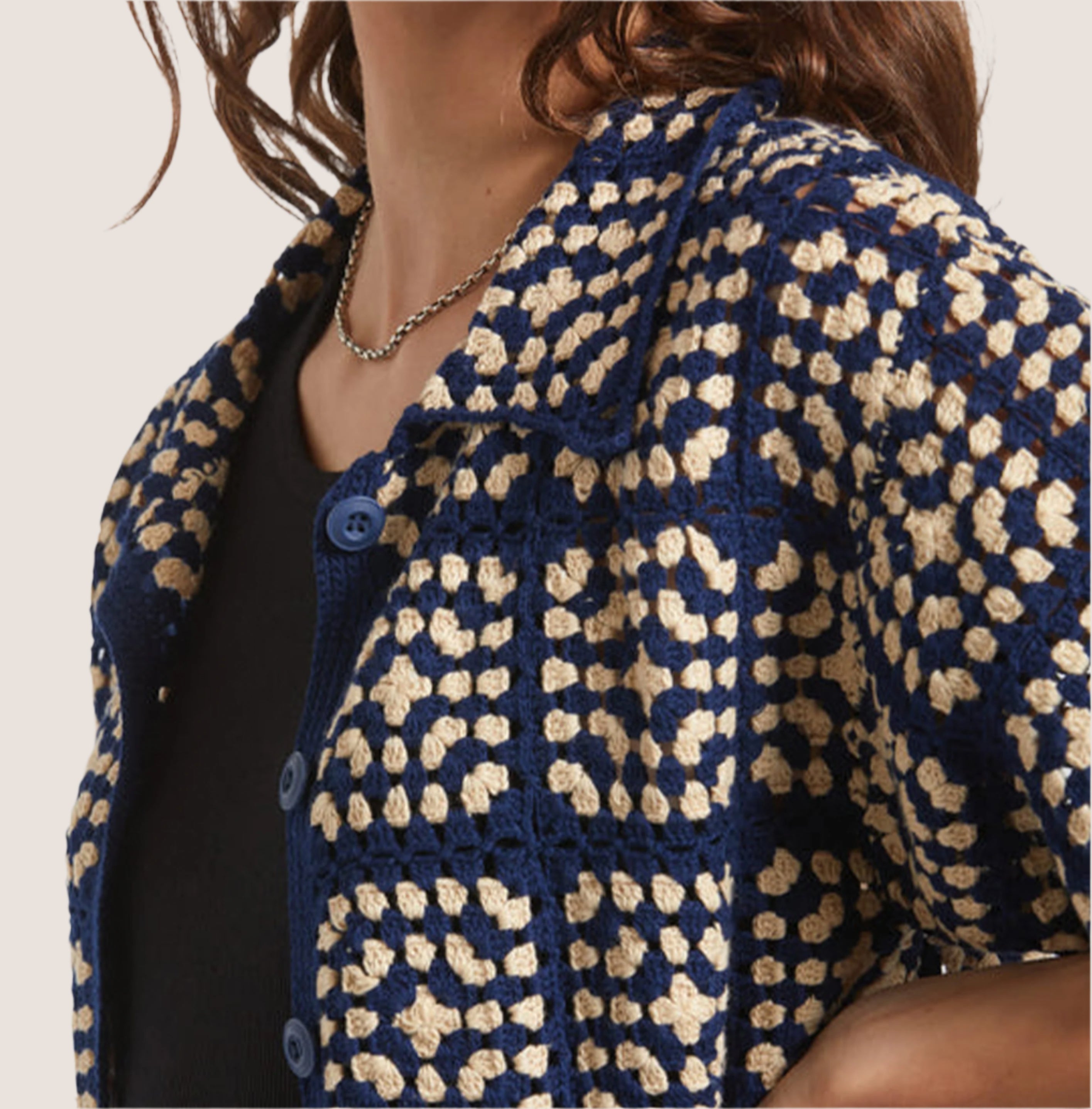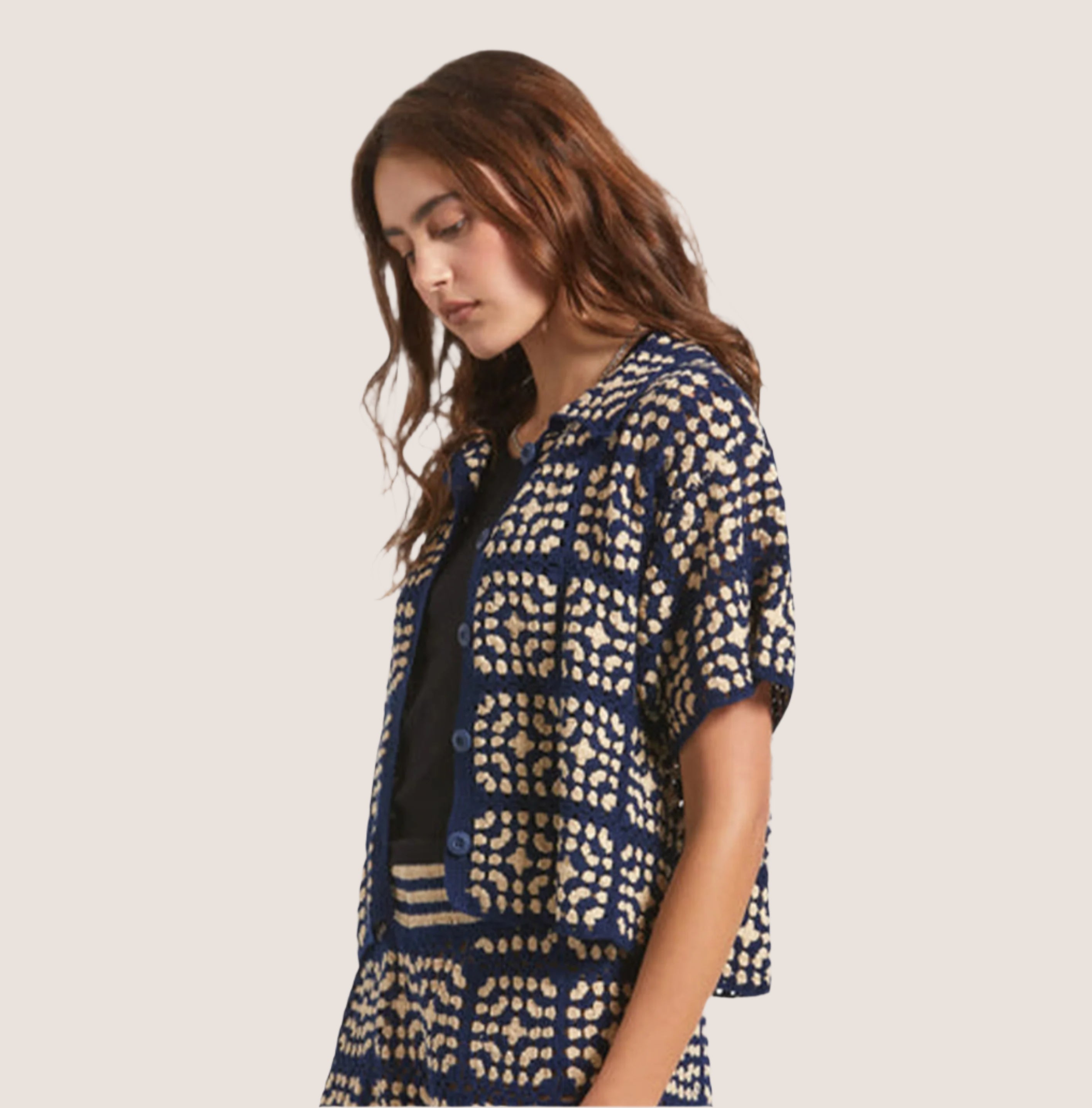 Crochet S/S Button Down | Mood Indigo/ Off White