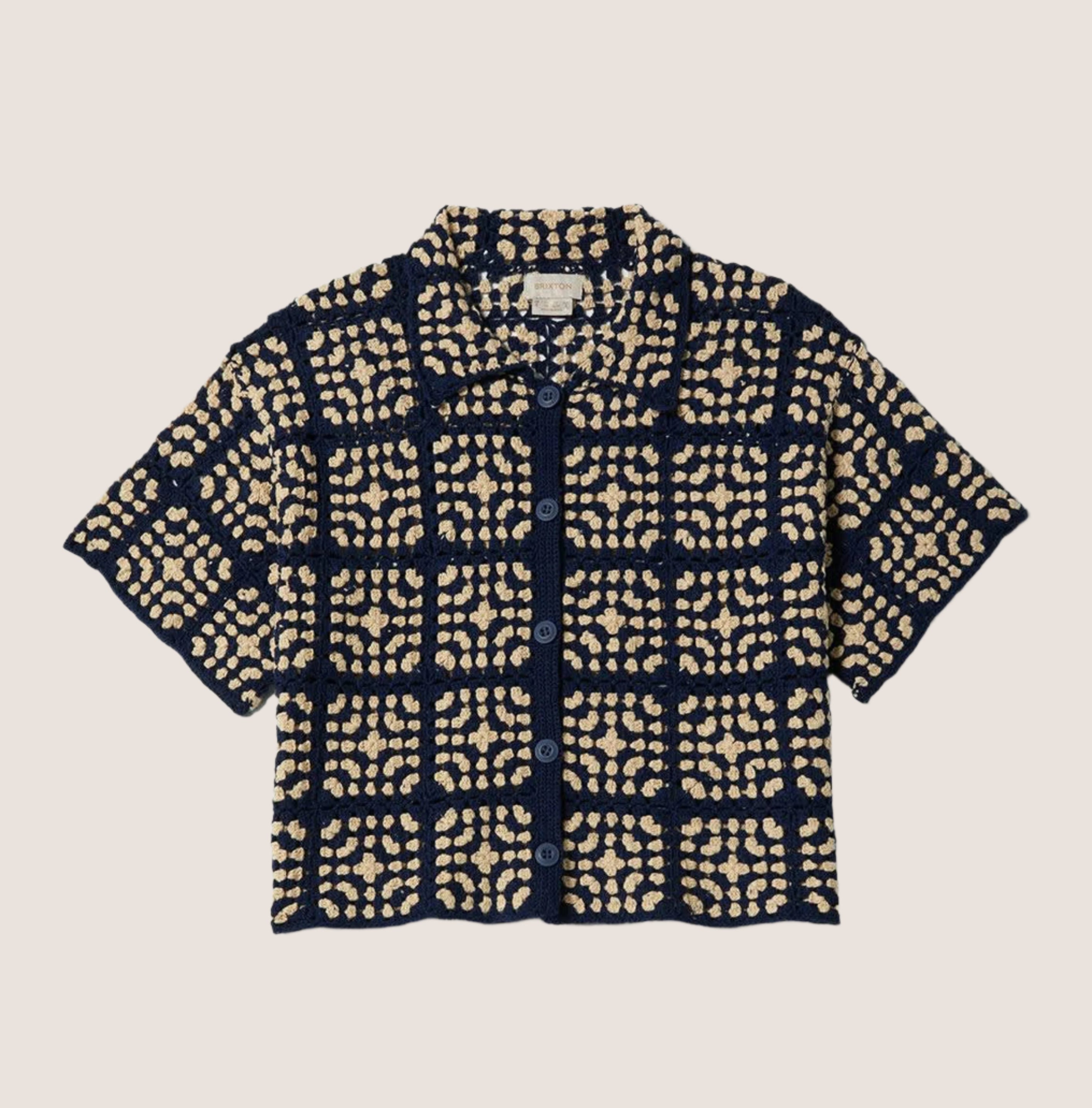 Keep it breezy and ultra-stylish this summer with the Crochet Short Sleeve Button Down by Brixton. This lightweight, breathable cotton crochet top is truly handcrafted, featuring an intricate indigo and off-white pattern for a vintage-inspired look that stands out. It's made in a laid-back camp collar button-down style with short sleeves, making it easygoing and eye-catching. This isn't just a top; it's your perfect warm-weather essential for staying on-trend while keeping cool.