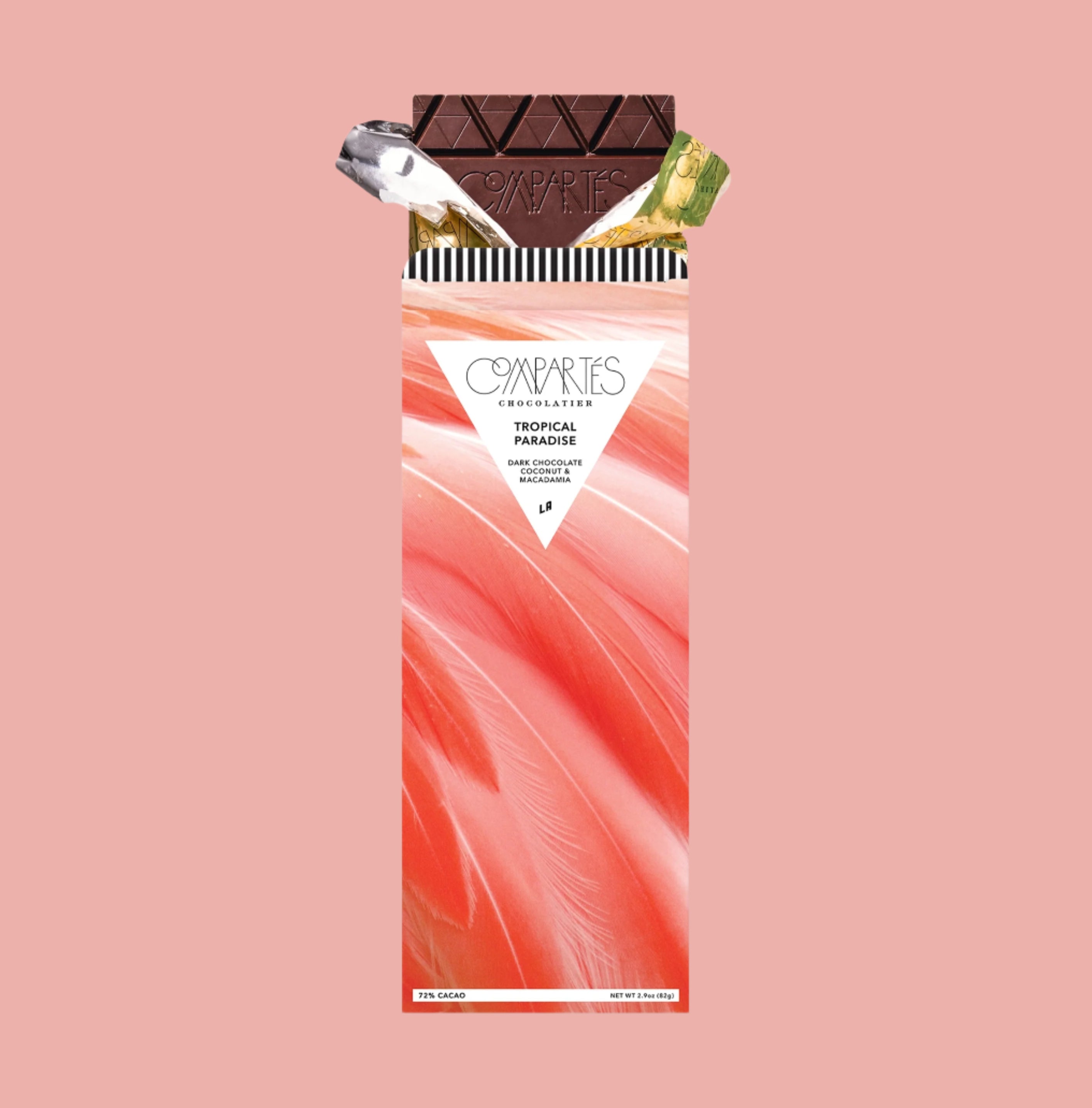 Indulge in the Dark Chocolate Coconut and Macadamia bar—rich, dark vegan chocolate loaded with roasted macadamias and toasted coconut for a dreamy tropical treat! This deliciously fun bar, featuring a stylish flamingo design, will whisk you away to a sunny Hawaiian getaway with every bite.
