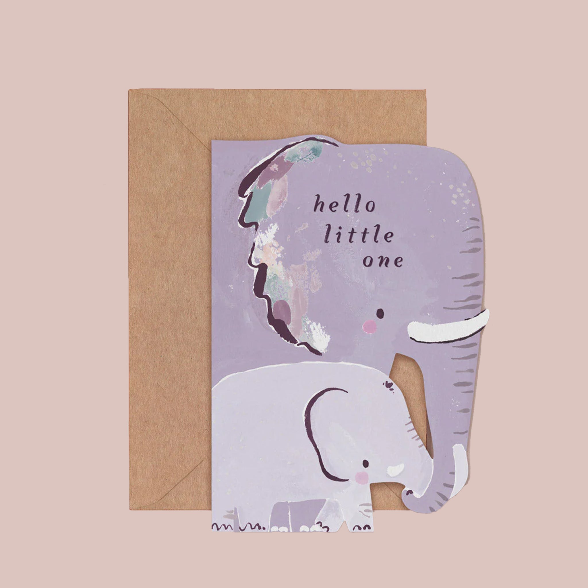 Celebrate new arrivals with this playful Elephant New Baby Card featuring a sweet scene of a baby elephant curling its trunk and tail alongside its parent. Die cut to highlight the charming hand-painted design, it carries the warm message "hello little one." Perfectly gender neutral, this card is an adorable way to welcome babies, honor adoptions, and celebrate all kinds of growing families.