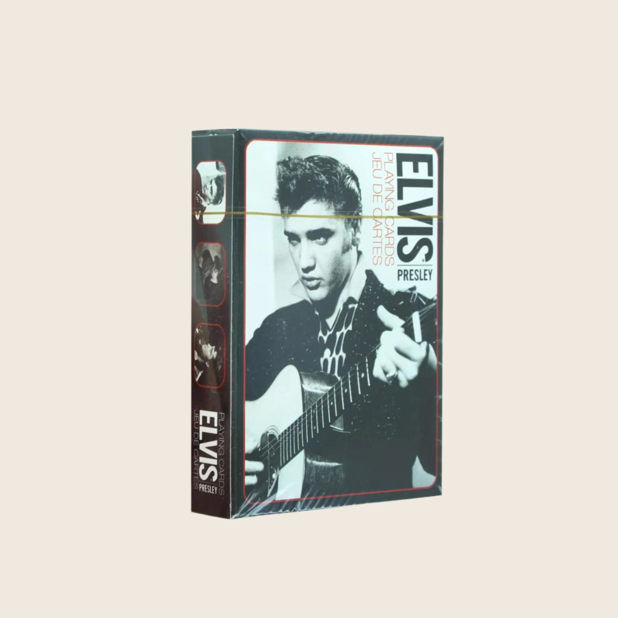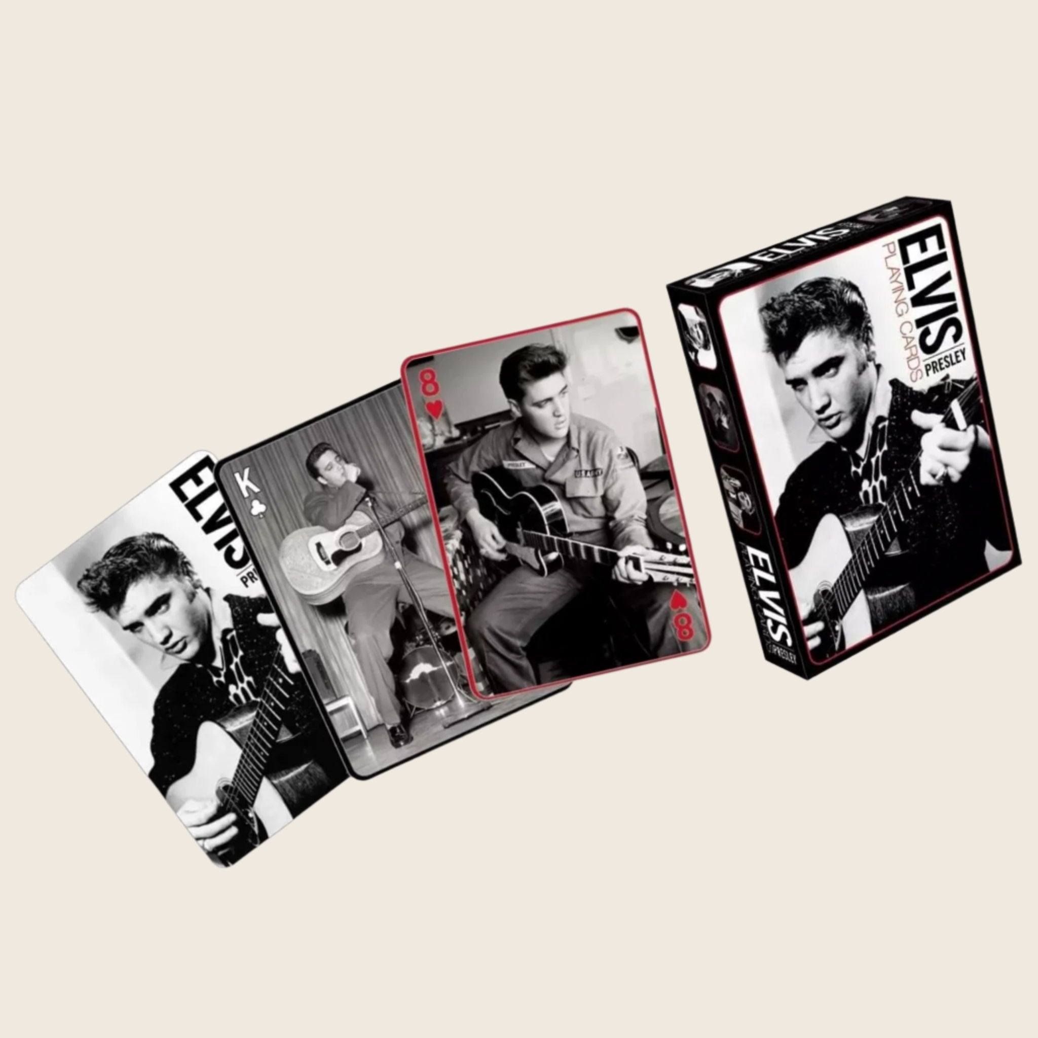 Play your favorite card game while wowing your friends with this classy black and white colored deck of poker sized playing cards featuring 52 different images of Elvis Presley. Cards measure 2.5" x 3.5" and have a professional quality linen type finish. Great for stocking stuffers, fans and players alike! Officially licensed.