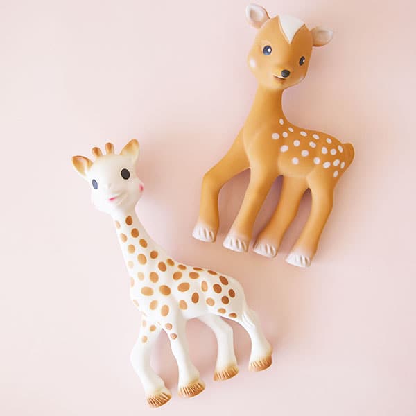 Sophie's best friend, Fanfan the Fawn soothing device made using 100% natural rubber from rubber tree latex and food-grade paint. It draws baby's gaze by way of the dark, highly contrasted spots all over its body and becomes a familiar, reassuring object that is easily recognized. Featuring a squeaker, Fanfan entertains baby, and develops baby's sense of hearing while helping to establish the relationship of cause and effect. Flexible with several chewable parts (ears, legs, etc.), it is perfectly suited to help soothe baby's gums when getting first teeth. Because it is made from 100% natural rubber and 100% food-grade paint, it is completely safe for baby.