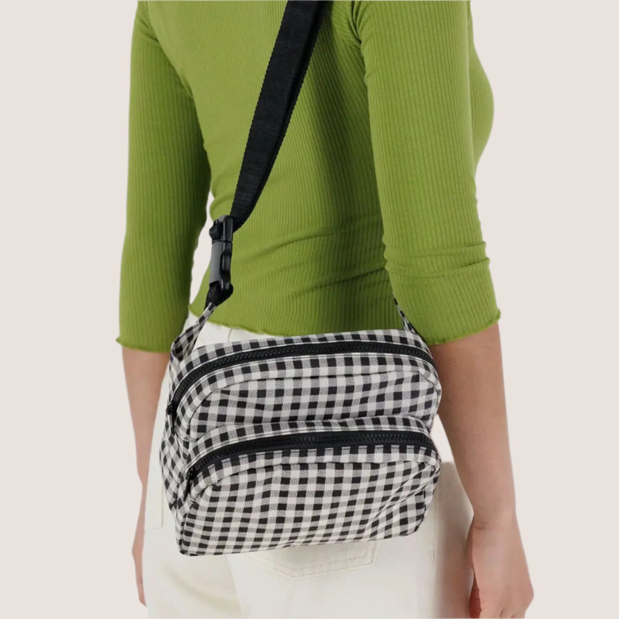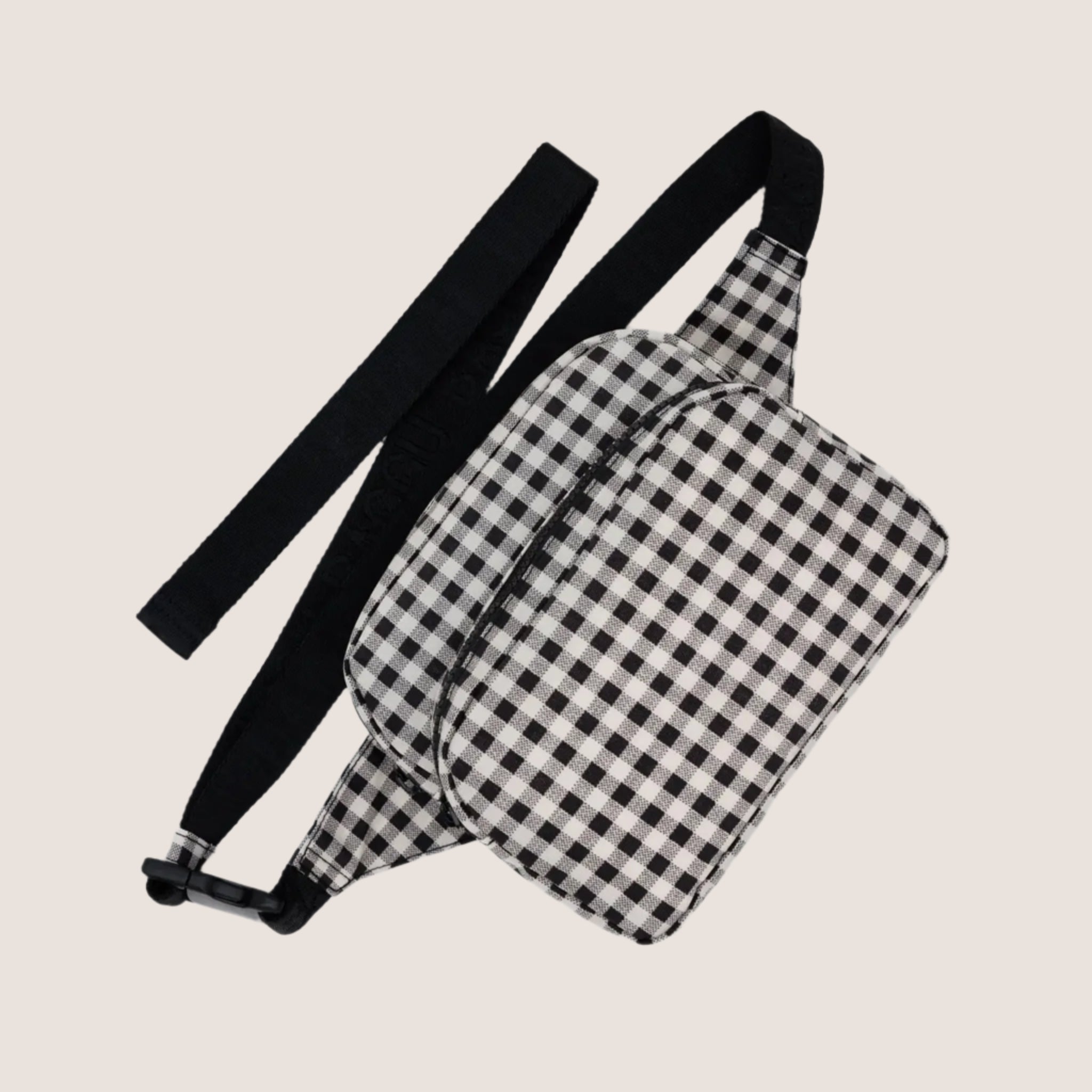 The Black and White Gingham Fanny Pack by Baggu is a hands-free bag for any outing. Surprisingly spacious and made from durable, heavyweight nylon for easy cleaning. Wear across your body, over your shoulder or around your waist.