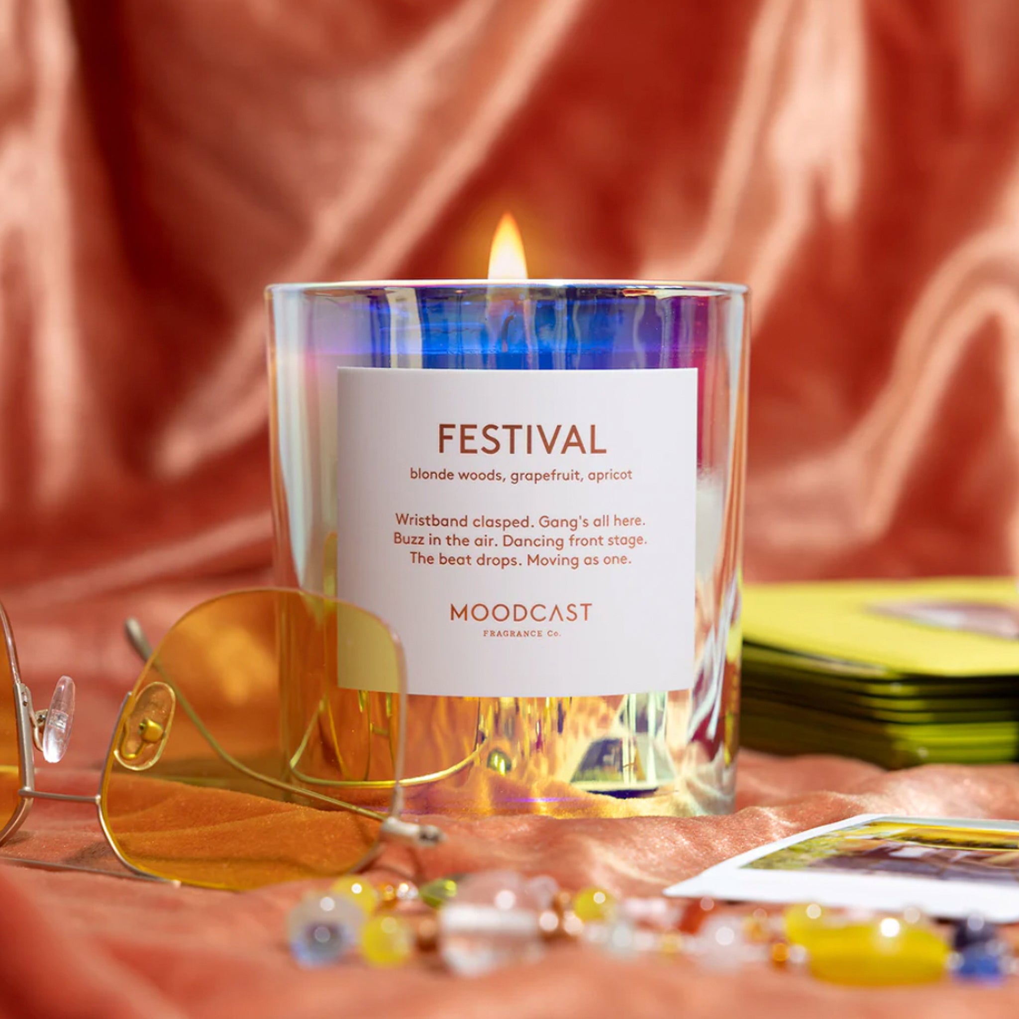 Get all the festival vibes with the Festival Candle! The nostalgic scents will bring back sweet memories while the adorable glass container adds a touch of funky style to any space. Light up your home and relive those fun festival moments with Moodcast Co's iconic candle.