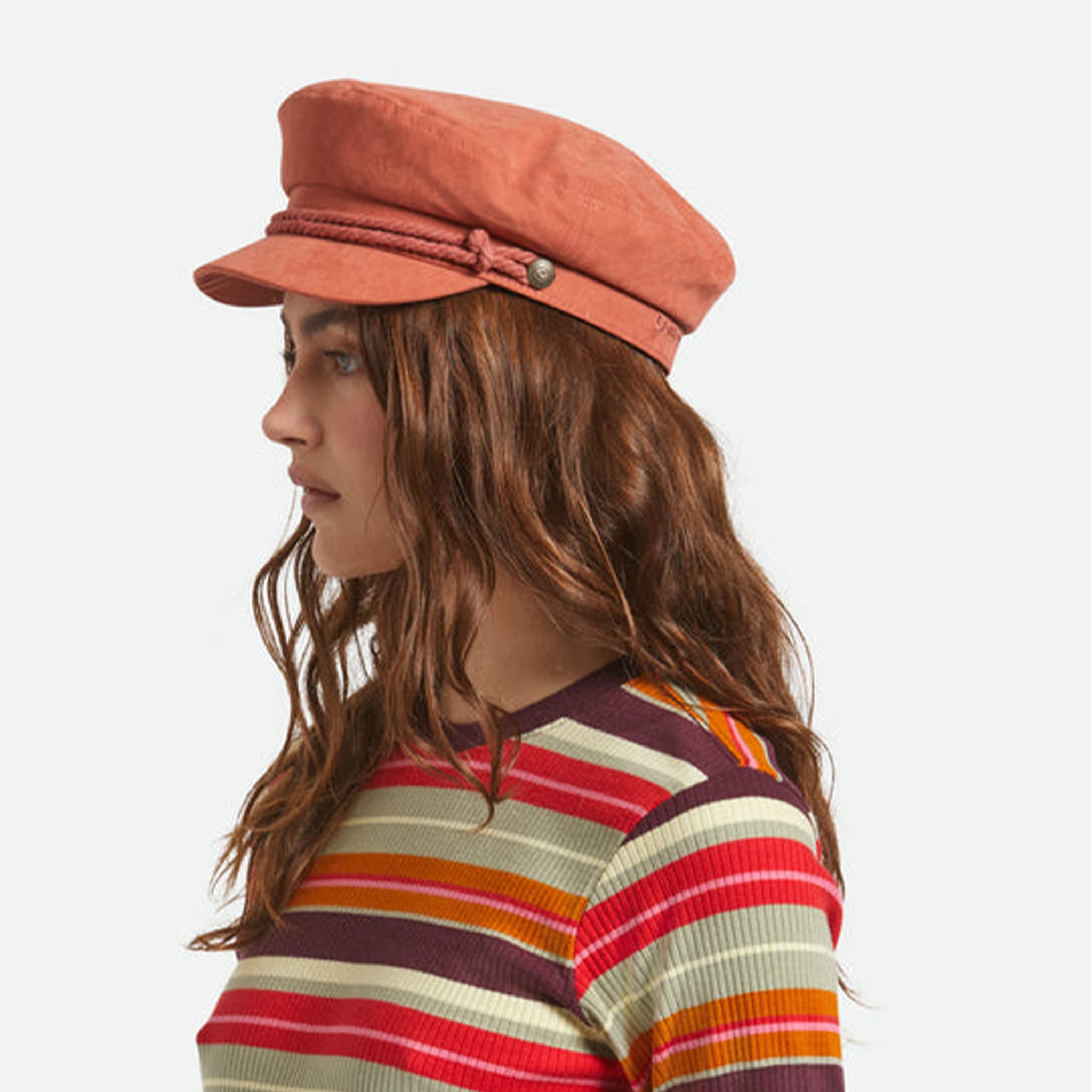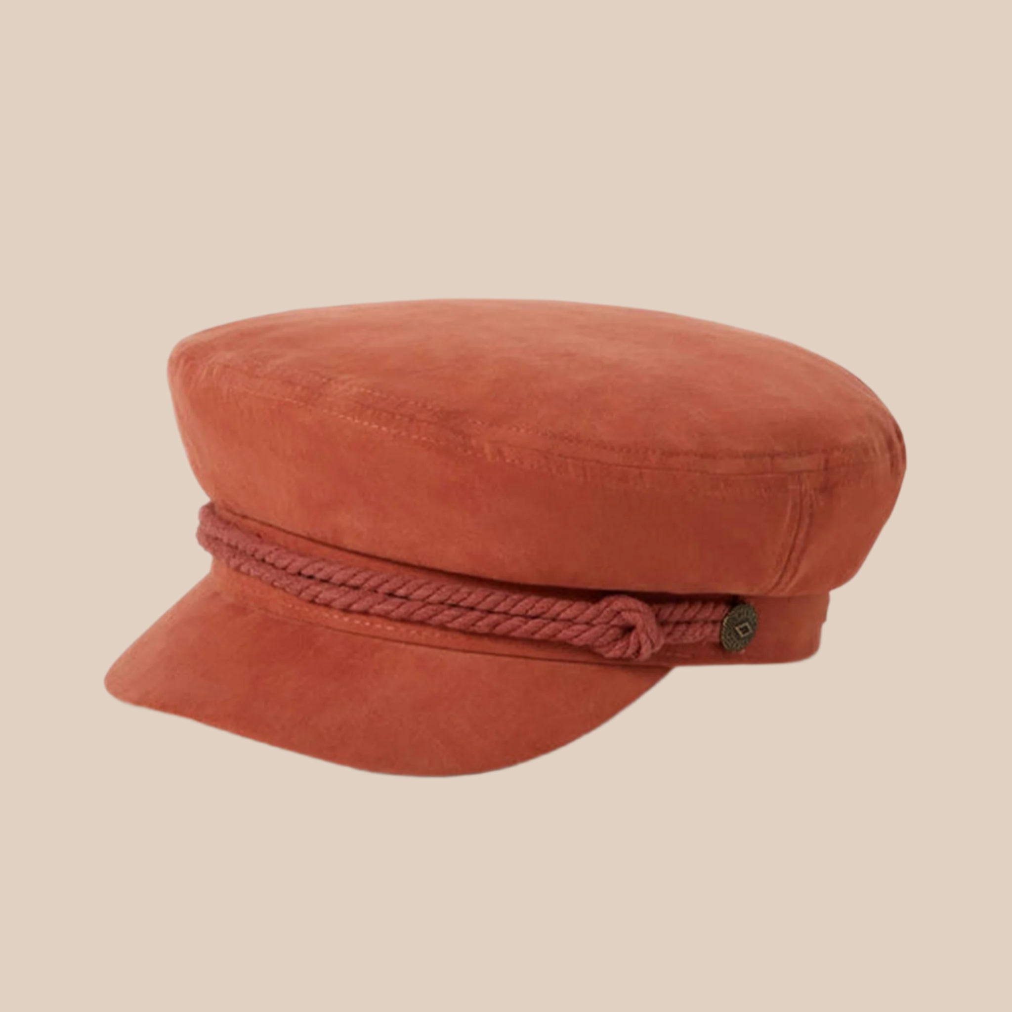 The Fiddler Cap in Terracotta Brushed Satin brings a playful twist to classic style. Crafted with mixed fabrics and featuring a double-layered cored design, it’s topped off with a sleek metal logo pin. Perfect for adding a bold, signature touch to any outfit.