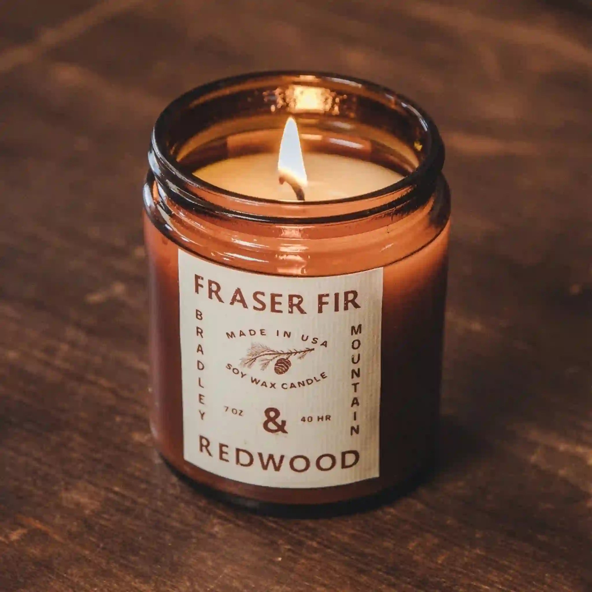 From Bradley Mountain's Amber Candle series: Fraser Fir & Redwood Candle . A gentle but potent scent that reminds us of the outdoors and holiday season. This unisex candle is the perfect gift or stocking stuffer for this holiday season.