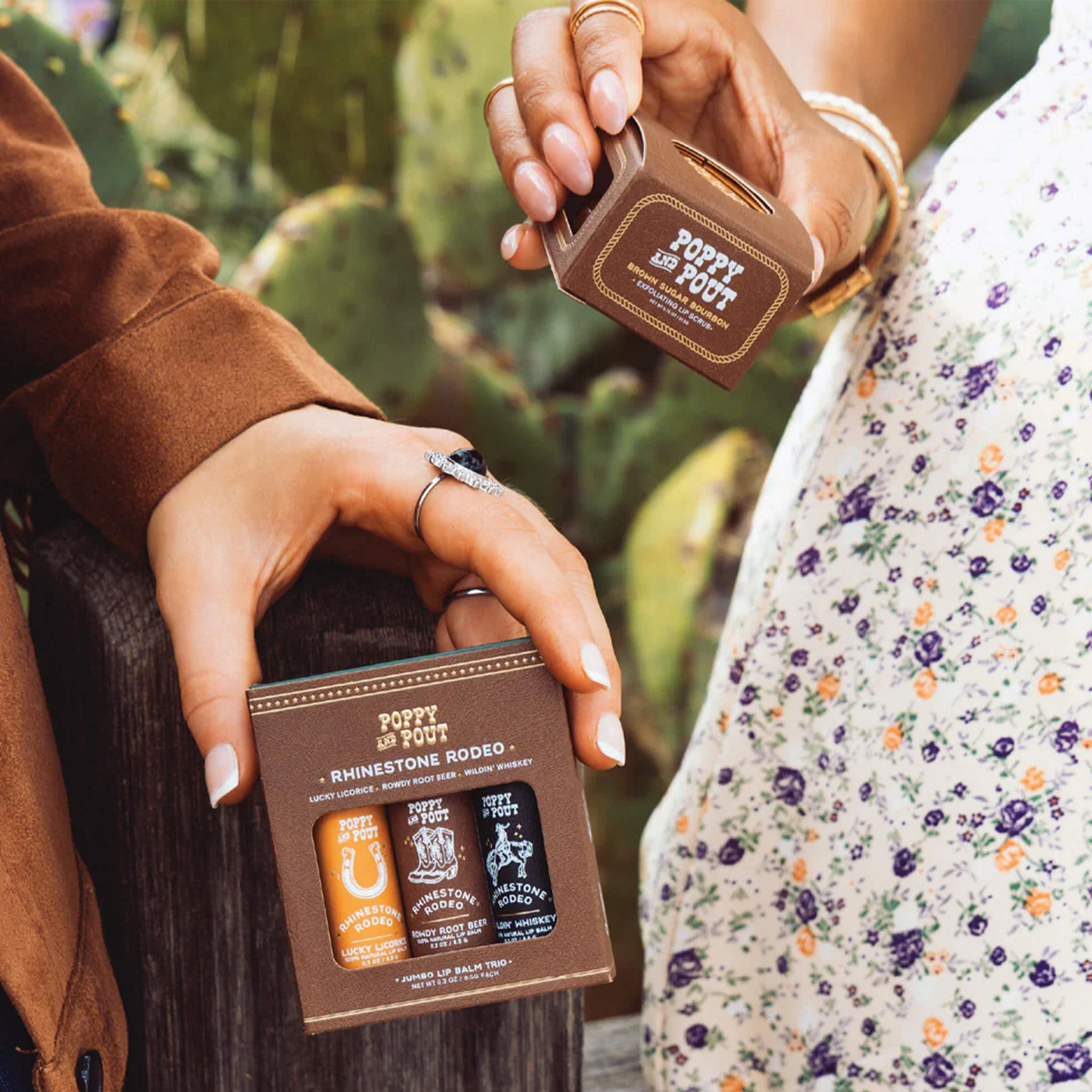 Saddle up for the smoothest lips in the West. This cowboy inspired lip balm trio features three flavors that will have you hootin' and hollerin': Wildin' Whiskey, Lucky Licorice, and Rowdy Root Beer.