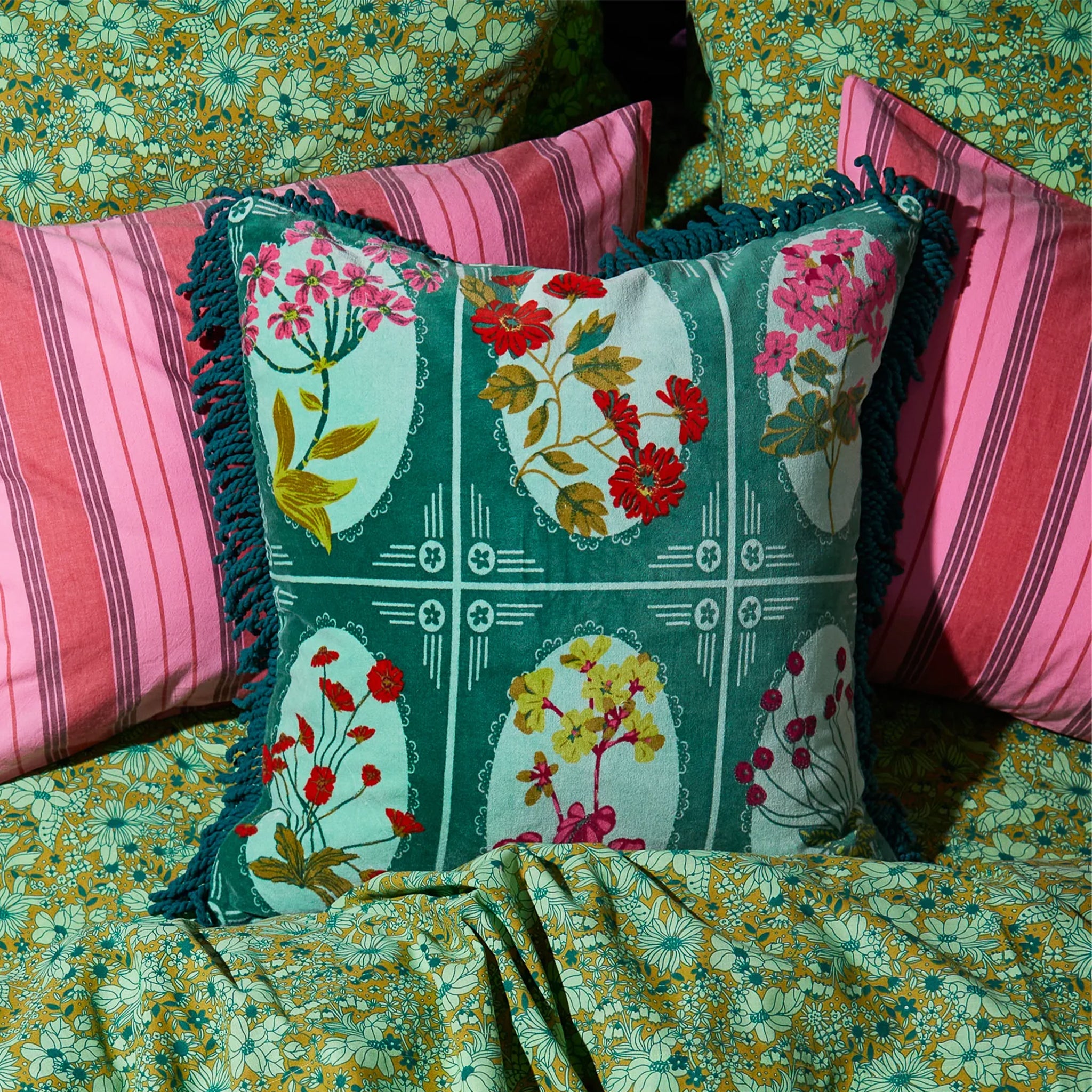 Transform your living space with Sage + Clare's Forest Gigi Velvet Cushion, a stunning green pillow adorned with vibrant pink and red floral prints. This gorgeous home decor piece adds an instant touch of luxury and personality to any room. The unique design and plush velvet texture make it an irresistible statement piece that guests will notice and admire. Don't settle for ordinary—elevate your home's style today.